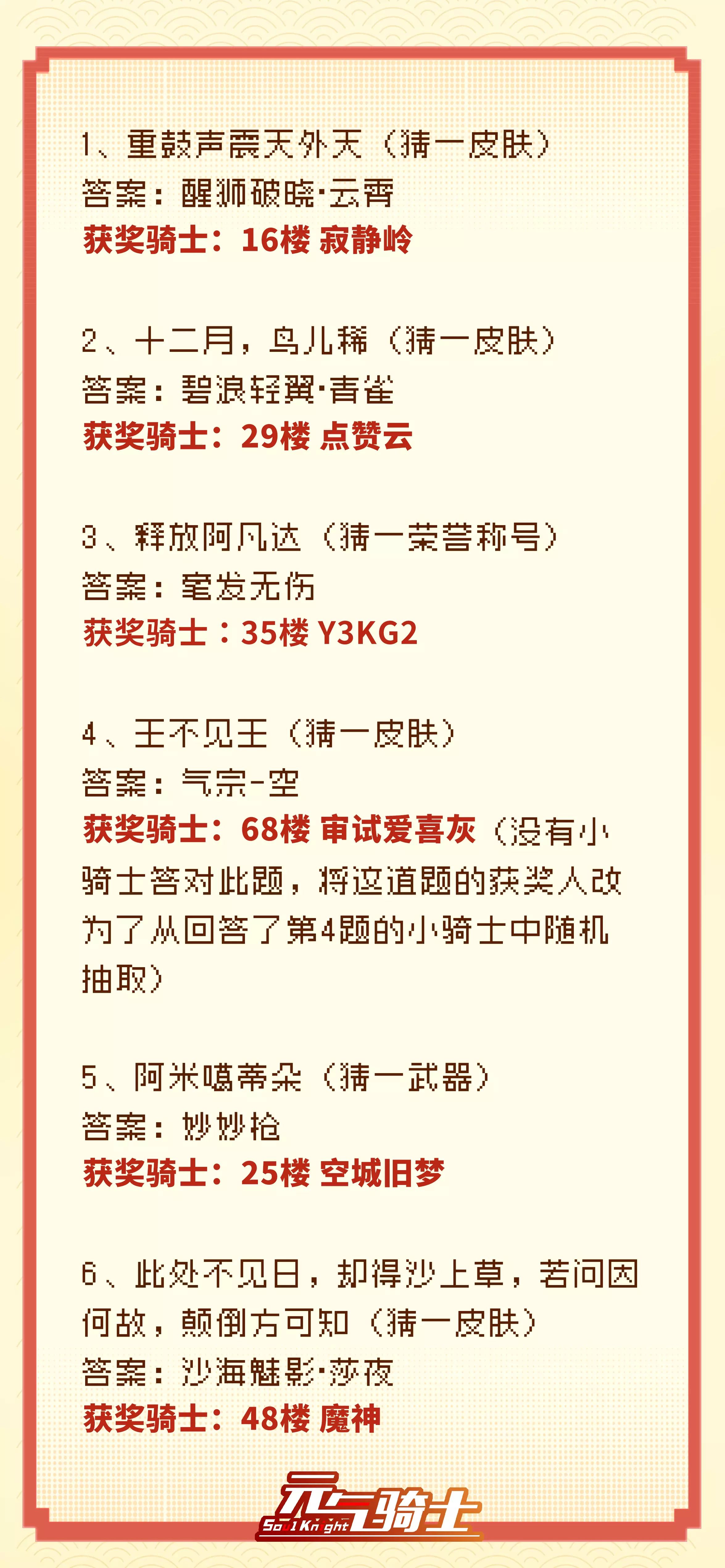 本次活动的谜底及机灵元宵奖获奖骑士如下: