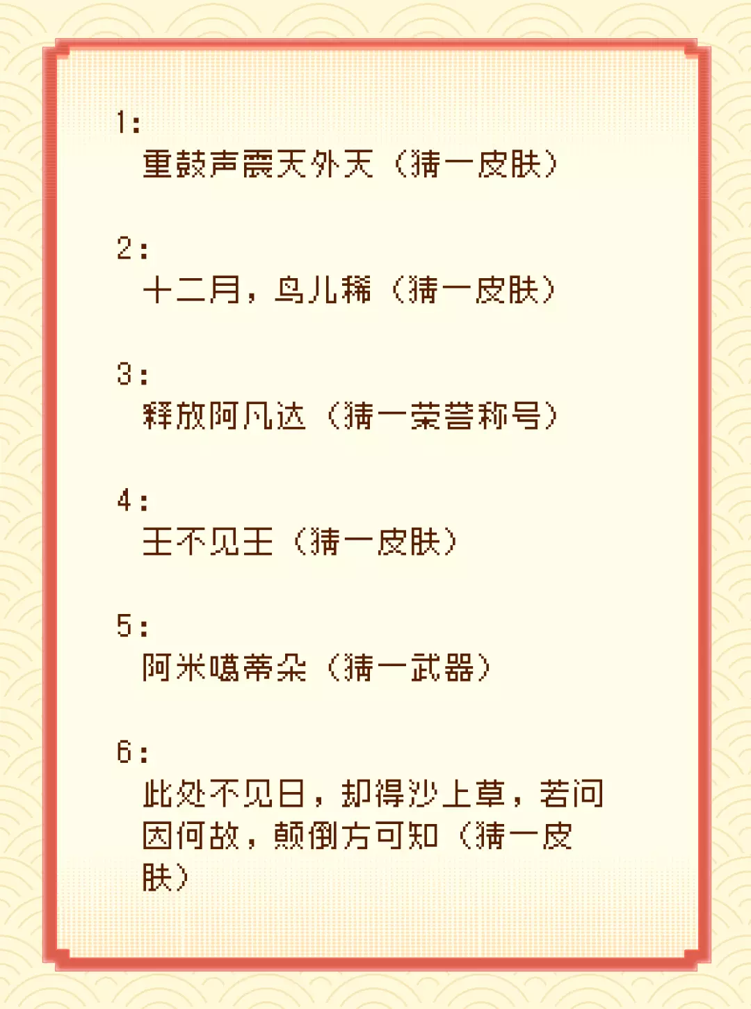 注意:每个玩家最多获奖一次。若玩家为多道谜题的首位答中者,该玩家仍只能获得一份奖励,谜题的首位答中奖励则顺延至第二/第三/...位答对者。