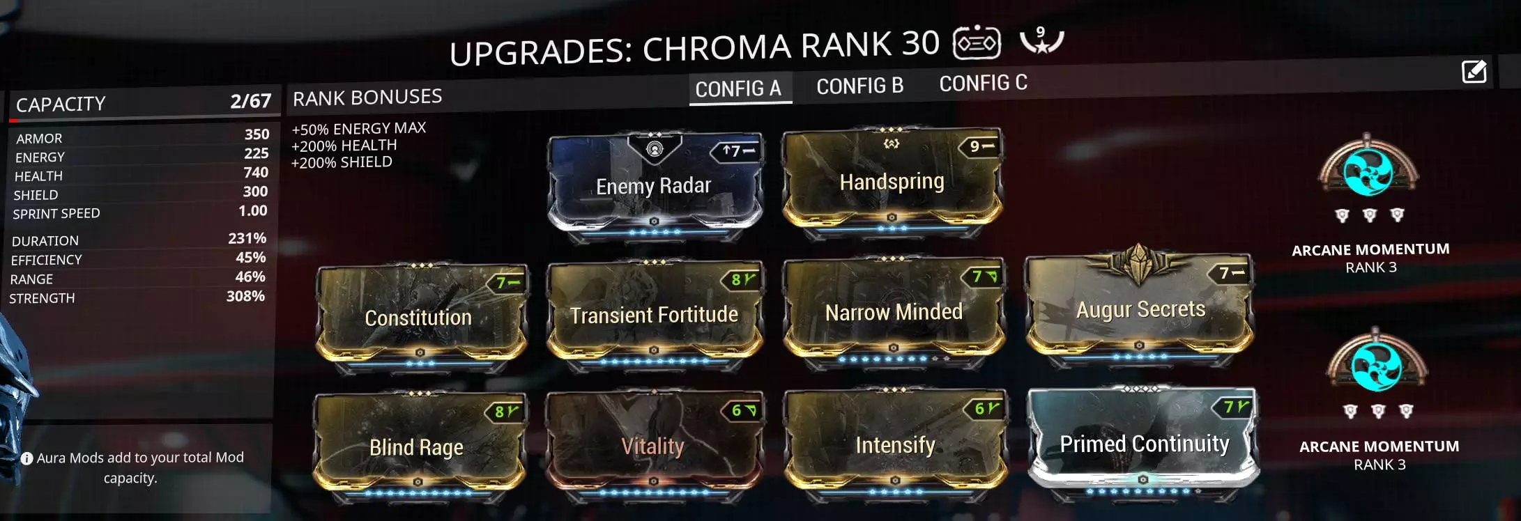 奥伯龙几乎能满足你狩猎兆力使所需的一切,因此几乎每项属性都有一定重要性。唯一不必太过在意的属性是持续时间,即便如此,使用【持久力Prime】将其提升至73%,可使【圣佑领域】持续14.5秒,这对于抵消能量打击来说已经足够。但配装中需要一些范围属性,因为你的队友必须站在技能范围内才能从中获益,你的治疗量也取决于范围属性。你还需要一些强度,它能增加治疗量。 DPS战甲的配装以及武器配装的不同方式。 【 chroma 】和【 rhino 】