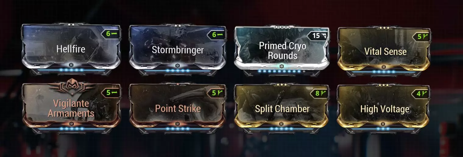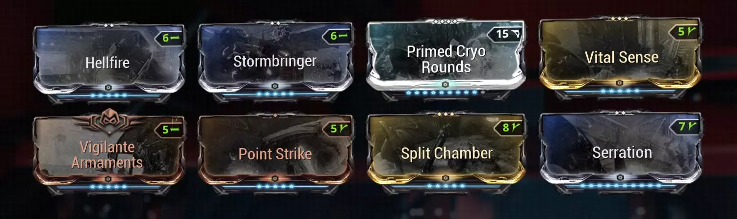 Here having a high raw damage stat modifier is benefitial. Roar is an absolute damage modifier, it works in a similar way as a Bane of "insert fraction here" mod, it takes the weapons complete modded damage and increases it by the % you have on your build. Keep in mind, a Roar-Rhino is only an objectivly better DPS if you have a Riven with the raw damage stat. Let's talk Riven: As mentioned, the biggest Difference is in the Riven you want for the different DPS. But there is no doubt about the utter God-Roll being either: Critical Chance (CC) or Critical Damage (CD) with Multishot(MS) and a good negative like -zoom or - >26% Magazine Capacity on Vectis or CD,MS, CC with a good negative However, another very viable option for a Chroma DPS would be trading the CC stat for electro or heat damge to add towards the radiation damage, or trading the CC stat for raw damage when you play Rhino. Rhino becomes superior if you have one of those raw damage riven. When it comes to intalling a Riven into your build, it highly depends on the stats of your Riven. If you have a Riven with MS and CD, but without CC you could replace Vigilante Armaments with the Riven. But if you happen to have a Riven with CD and CC, you could replace it with Point Strike. There is no direct rule to follow here, and the builds above are just rough examples. Just try a few different combinations and stick with a relyable one. The different weapons and why you should use them. I want to start this section with the more important weapons. The DPS-Player's Primary source of damage and, incase of Chroma DPS, a way to self damage. It doesn't matter if you are using a Lanka, Rubico, Vectis Prime or even a Euphona, as long as you can kill every Limb with one shot you are good to go. Please don't overlook the potential of Rubico and Vectis, they can utilize the Combo-Mechanic of sniper rifles and triple their damage quite fast. The general build for every weapon is esentially the same, however every weapon has up- and downsides and I want to go over every Sniper I find viable for Eidolon-Hunting. Lanka: The biggest benefit of a Lanka is the pure Electricity damage type, it also is the hardest hitting sniper of the bunch when it's fully charged. Thus it can become a real Eidolon-Buster with a sub-optimal Riven. The scope-bonus of a Lanka increases the CC of your weapon but it goes up to a 8x zoom, so a -zoom riven can be quite handy to reduces the zoom effect while utalizing the CC bonus of the scope. The biggest downsides of a Lanka are the charge up and projectile mechanics. Even though you're never shooting at high distances during the Eidolon fights the non-hitscane projectiles can lead to some missed shots, specially when you are firing at the armpit/neck Synovias. A missed hit can be quite a problem, especially when you have a long charge time(low fire rate) and lose a lot of time. The Lanka also has the biggest zoom while scoped in complelty, it can be quite dis-orientating. Rubico Prime: The Rubico P has a high clip with very good fire rate, combining this with double Arcane Momentums can bring some very quick combo charges. The high clip and good fire rate also make a missed shot much less of a problem since a followup shot can be place very quickly, the risk of missing is also reduced because the Rubico P is a Hit-scan based weapon. The Rubico P also has the highest Crit-Stats of the snipers, this got further amplified with the Rubico Prime. The extra 8% base cc made the cc-stat on riven or further cc mods like argon scope rather obsolete. The Rubico Prime is in my opinion the best sniper for Eidolons right now. Riven prices rose a bit and are on the same level as Lanka Riven and it makes sense, both guns are on about the same level when it comes to performance during Eidolon Hunts. The biggest downside of the Rubico P is it's relatively low base damage, it pretty much needs a half decent Riven and some Combo-Bonus to oneshot the Synovias. Vectis Prime: The Vectis Prime has pretty decent base damage with an average 2x CD multiplier, based on my experience it's head-to-head with the Rubico P, however, the Vectis doesn't have the high clip, but a much faster reload, this also makes building a decently high combo quite easy when you use dual Arcane Momentum. The two round clip and the really fast reload speed makes using Argon Scope and follow up shots really easy. I am not sure if this is a up- or downside but the Zoom-Bonus of the Vectis Prime increases just the headshot damage, thus only being used for the last shot on every Eidolon. The only real downside to the Vectis Prime is the lower base damage when compared to the Lanka, it also needs some Combo-Bonus to oneshot Synovias. Getting a good enough Riven for the Vectis can also be quite expensive since it's the best sniper and one of the best weapons for general use in normal gameplay. The fastest way to charge your Vex buff as chroma would be a throwing type melee weapon, idealy a Cerata, with this build: