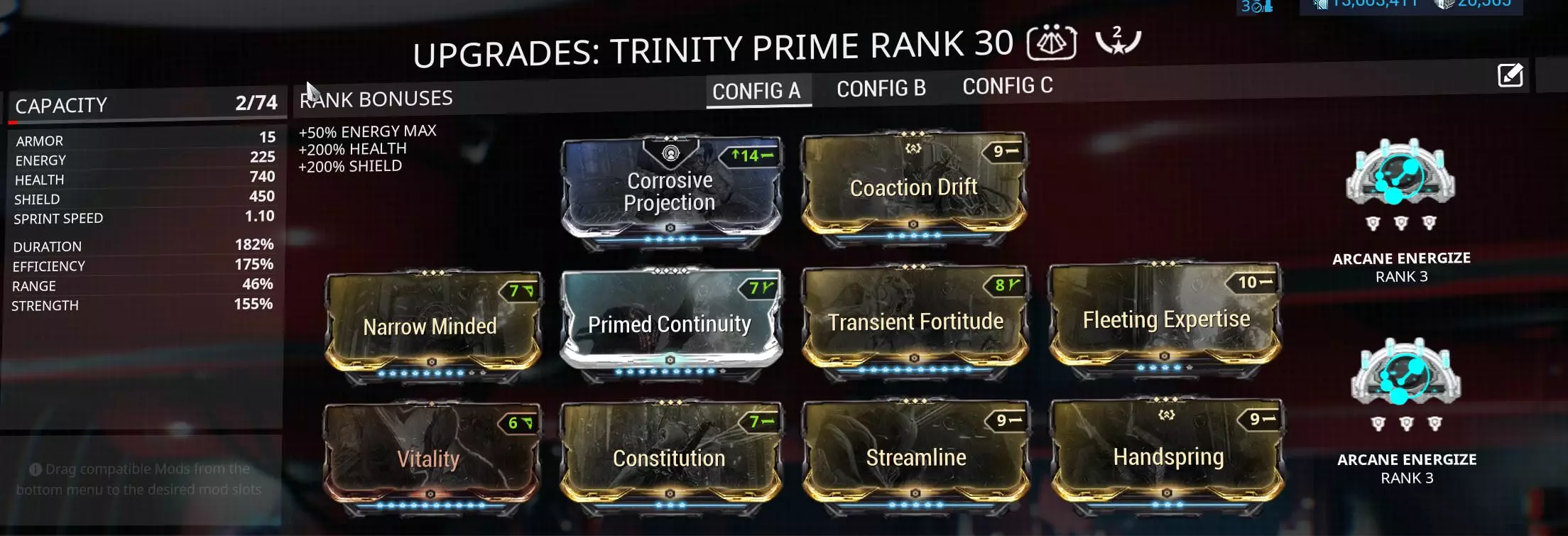 这里最重要的属性是低持续时间,通常85-90%的持续时间会比较舒适。这足以让输出职业获得肢体的控制增益,也足以抵消整个能量打击。低持续时间很重要,因为你无法在技能结束前重新施放该技能。 范围属性可以完全忽略,因为该技能使用的是亲和范围。 三位一体/三位一体Prime: