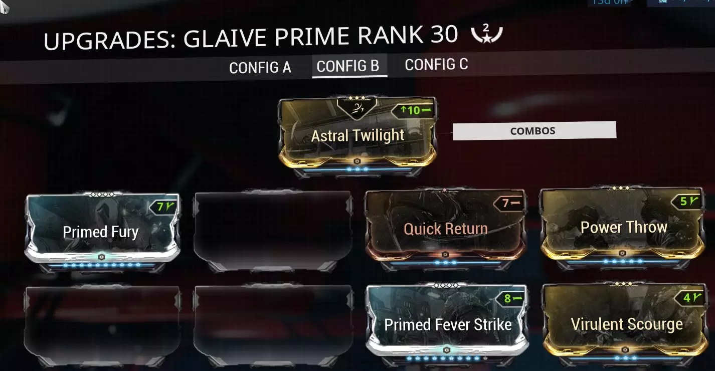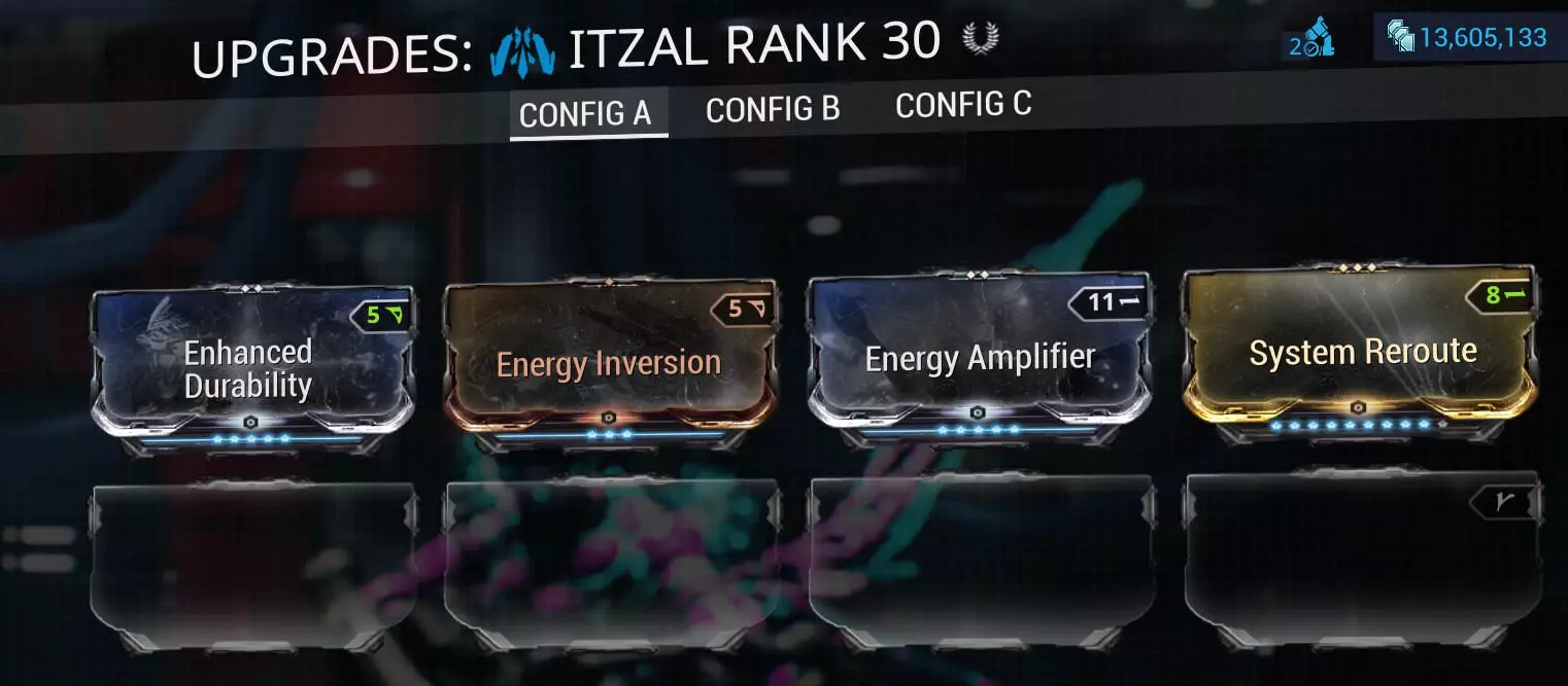 要启用自残机制,需要这些模组或其非Prime版本。 自残的次优选择是投掷型副武器,例如Spira/Prime,搭配隐蔽爆炸模组。 我强烈推荐队伍中的VS使用者使用兰卡,当输出位的增伤 buff 消失,需要有人接手时,它无疑能造成最高伤害。 除了兰卡作为主武器外,我推荐使用射速尽可能快的副武器。 双毒蛇/幽影、阿科玛提、DEX 弗里斯或光束类武器都非常适用。这样做的原因是为了在每次击败 Eidolon 后,能尽快消耗掉剩余的 VS 充能。除了上述提到的武器外,潘德洛的次要开火模式能以7的基础射速发射8发 burst。69发/秒。这能确保无论何种情况,你都能以全新的VS充能开始。记住,如果你频繁使用次要开火模式并以指挥官形态被击杀,你可能会以战甲形态卸下武器并失去所有充能。 选择的航道星舰(AW)及其配装。 对于夜灵,唯一可行的航道星舰是伊格尼斯。 其配装如下: