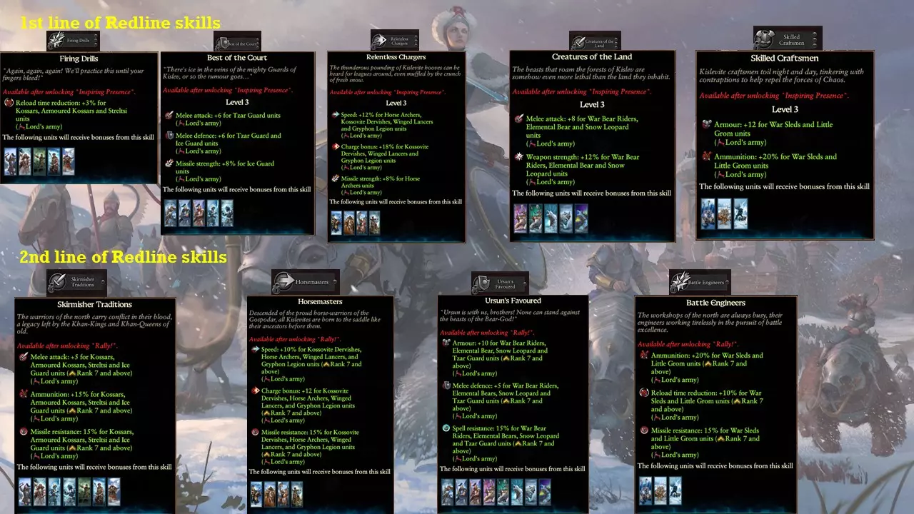 第三种是一种基于冲锋的部队配置,主要设计用于开阔地带而非攻城,非常适合伏击。 最后,我为你提供一些早期游戏的通用部队配置,不过基斯里夫在完成所有升级后,即使在游戏后期也完全可以使用这些配置。再次注意,所有部队配置在红线技能点的需求方面是多么高效。