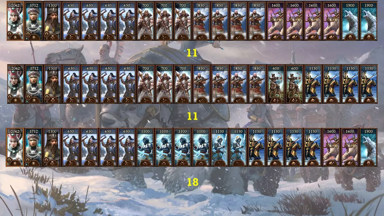 族长和冰霜少女都拥有提升战役或战斗的特定技能,因此两者在任何军队中都非常有用。族长可以提供补充兵力和治疗(如果你选择的话),我认为他们是任何军队的必备单位。 2级和3级单位在整个游戏中仍然有用。射击军、沙皇卫队、雪橇兵、翼枪骑兵……你可以用这些单位组合出很多战术。 鲍里斯能为军队中对抗混沌和诺斯卡的所有单位提供不错的 buff,这非常棒。战熊骑兵、元素熊以及沙皇卫队都能从他身上获益,组成一支强大的近战部队,这在配兵方案中尤为突出。如果你更喜欢加入一些远程单位,冰霜守卫无疑能轻松消灭你最可能遇到的敌人。