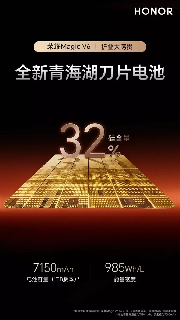 快科技3月3日消息,荣耀Magic V6已经提前在MWC2026上发布,该机最大的亮点之一是首发新一代青海湖刀片电池。 荣耀产品线总裁方飞发文介绍,这款电池极片厚度仅为0.15毫米,魔术般地做到薄如一张扑克牌,但却创纪录的带来业界最高的32%硅含量、985Wh/L最高能量密度和7150mAh折叠手机最高电池容量,打破可量产高硅电池三项纪录。