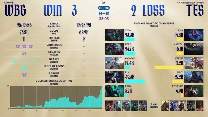 WBG在决胜局的时候,直接押宝ELK,上中野辅四保一金克斯,选出这套阵容的时候,观众其实都为微博捏了一把汗,因为现在的版本,虽然是以下路为核心,但一旦下路前期崩了,比赛基本上就结束了,微博四个肉的前排阵容,在金克斯没有成形之前,是没有很高的伤害的,只能拖。