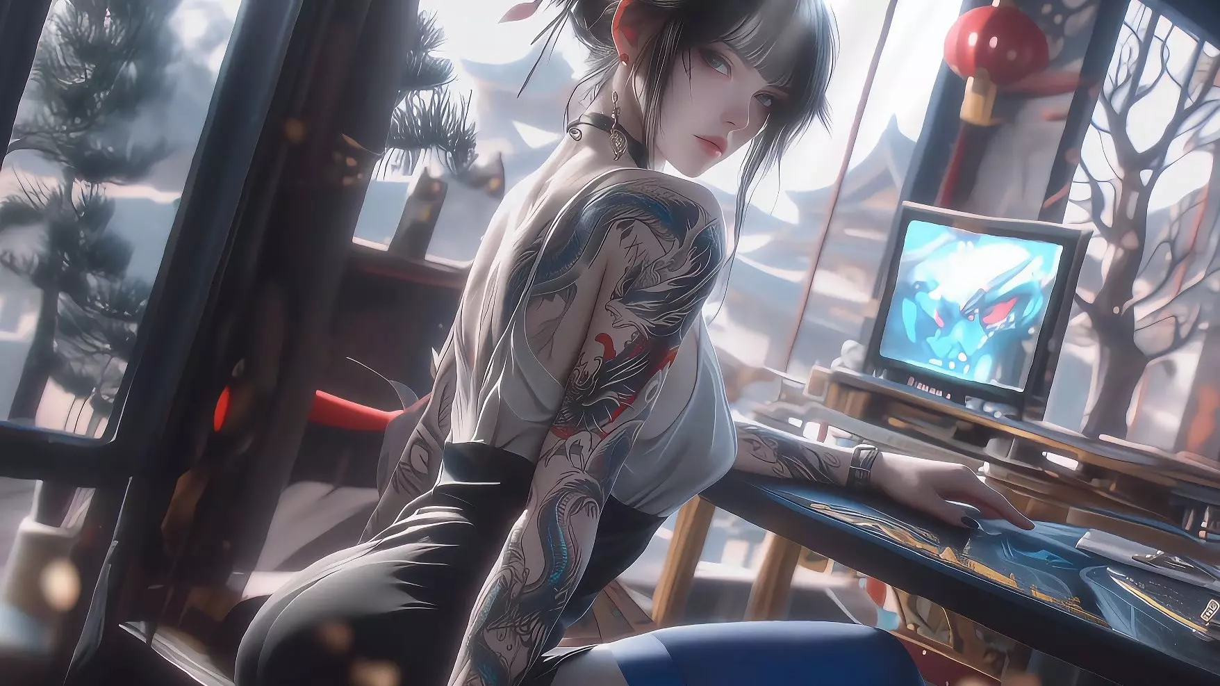 【Wallpaper Engine】花臂美女,古风茶室里的赛博江湖!