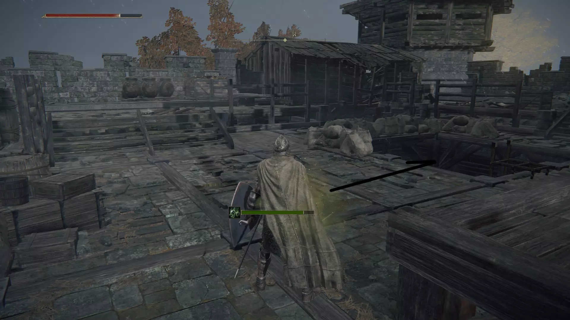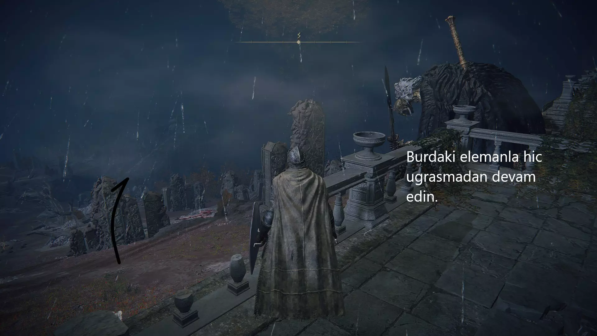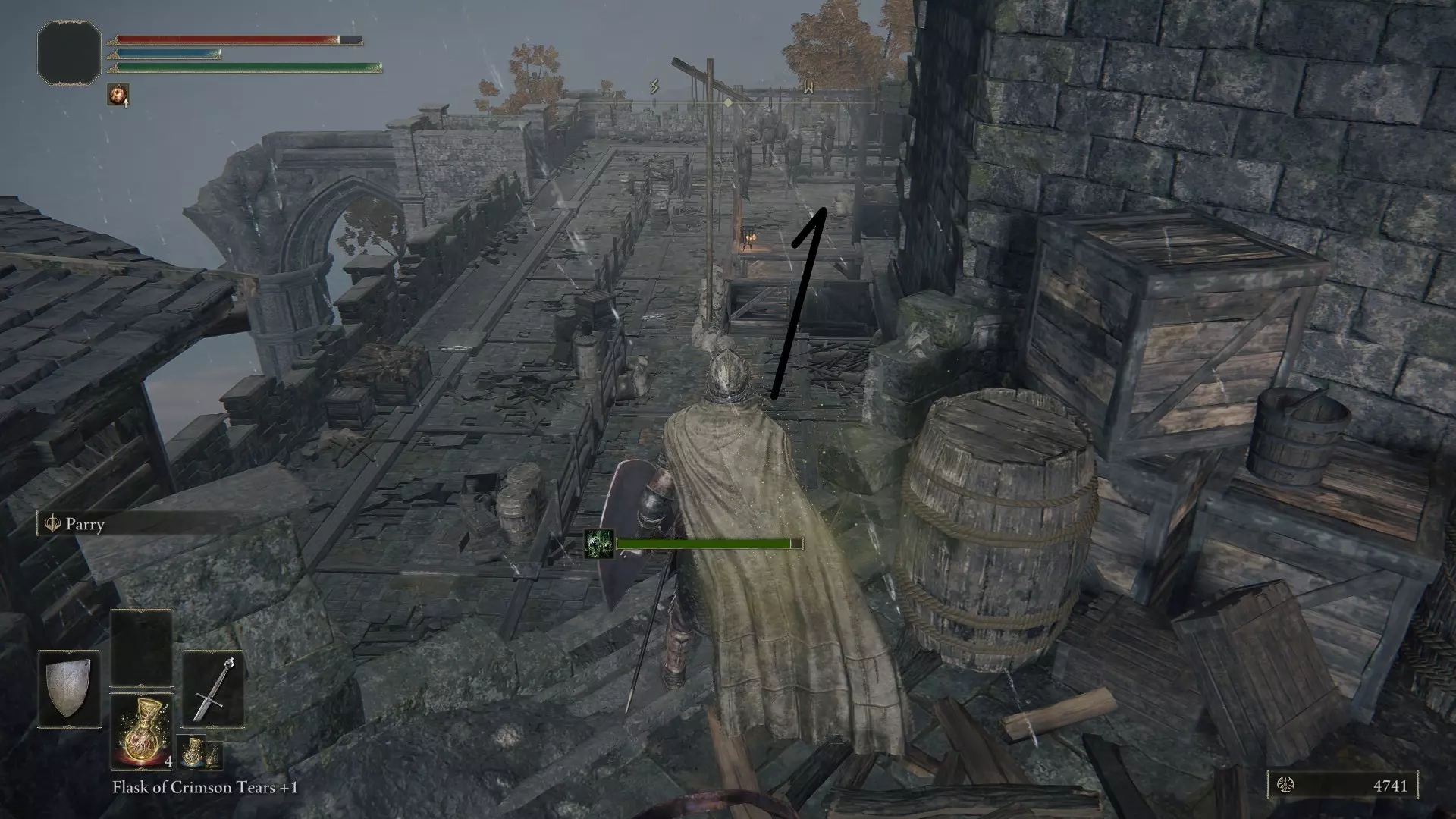 在你当前所在的位置,从高处往下看可以看到一座桥。从那座桥过去,不要与龙发生任何战斗,然后向右继续前进。往前走,在世界树的后面有气流,借助气流向上跳跃。从这里继续朝着城堡前进,打开大门进入城堡。在这里,你需要动作快一些,否则很容易死亡。进入城堡后,从前方左转,然后直走,快速爬上楼梯(这里的生物会让你中毒)。爬上楼梯后,你会在对面的箱子里拿到一个两部分组成的勋章中的一部分。这些勋章是后续你想要开启某个区域的关键物品。接下来从塔上跳下去,再从图片所示的位置往下跳,在这里拿到拉达冈的糜烂烙印,然后去打龙,开始收集卢恩。