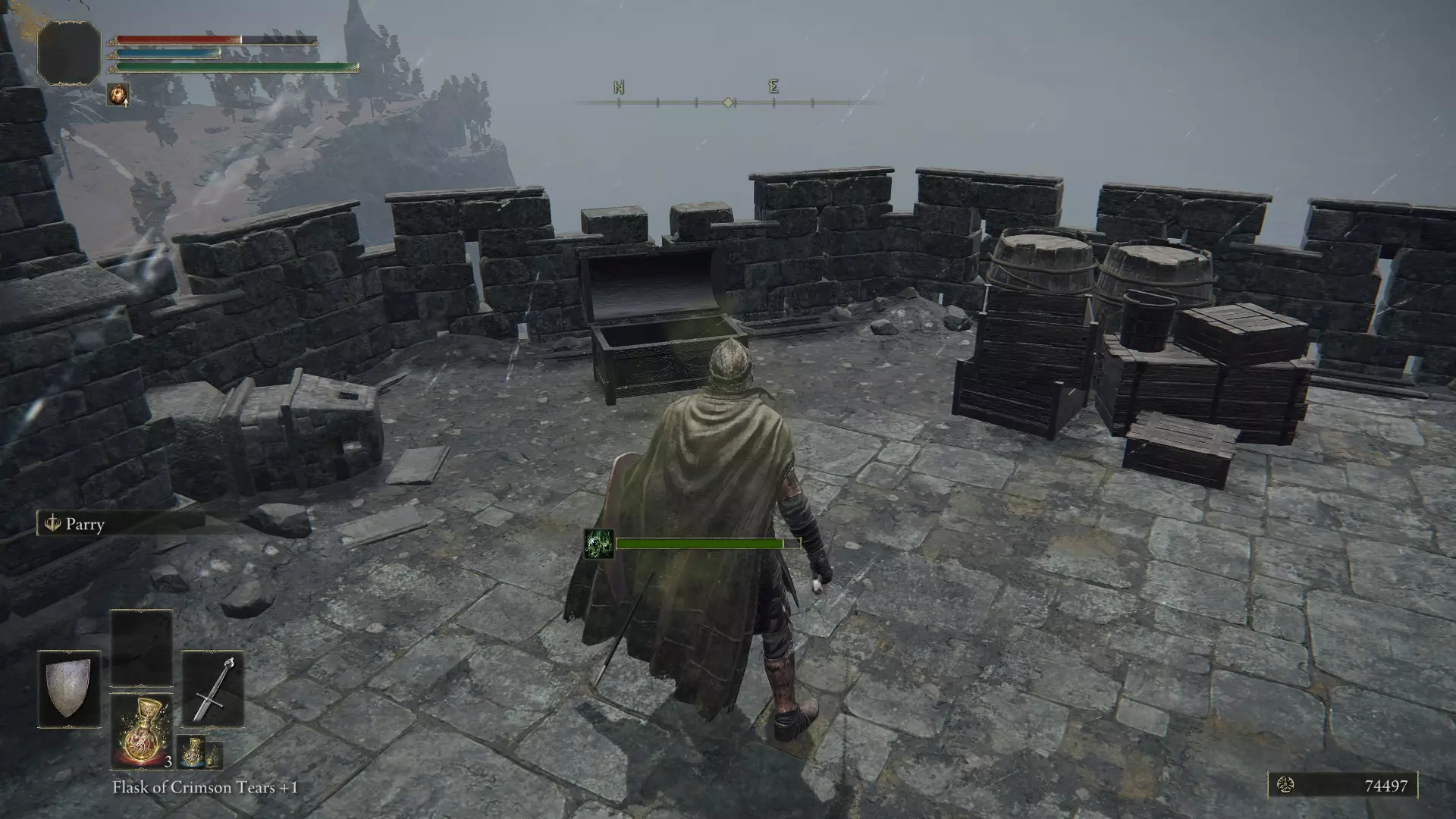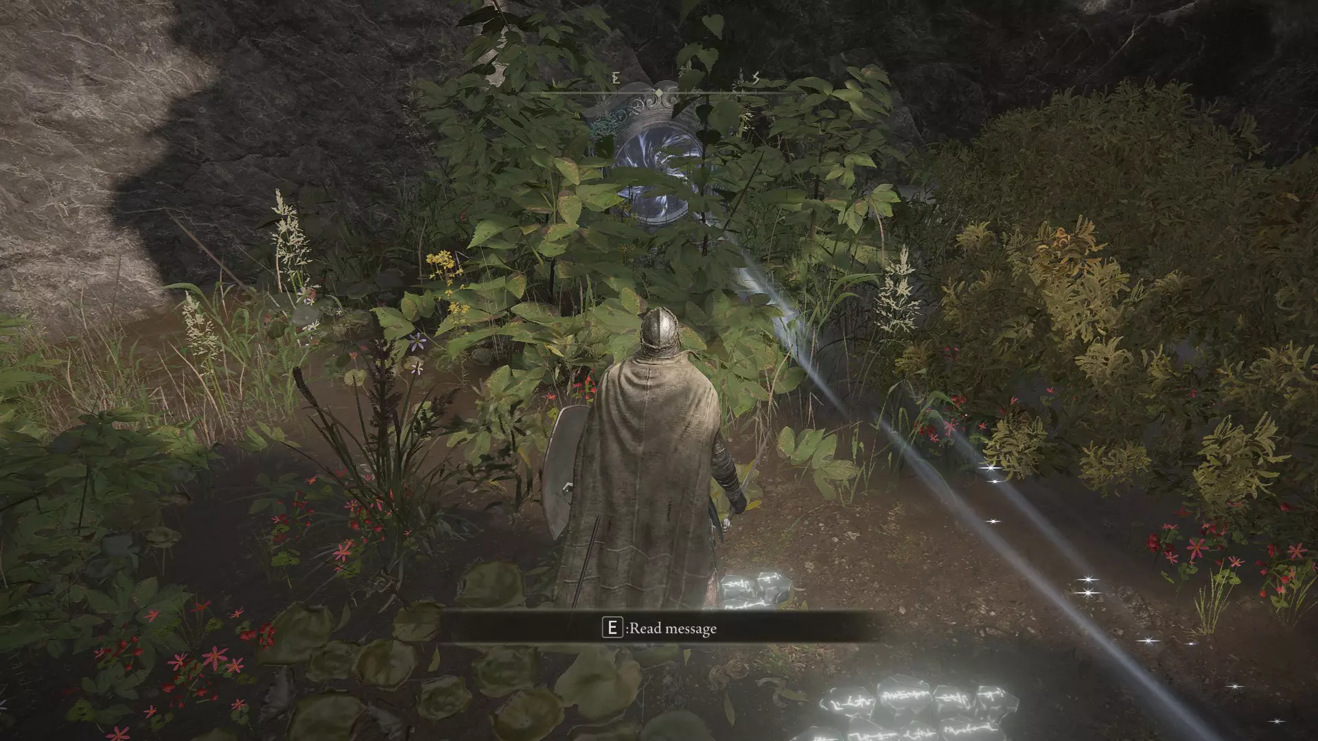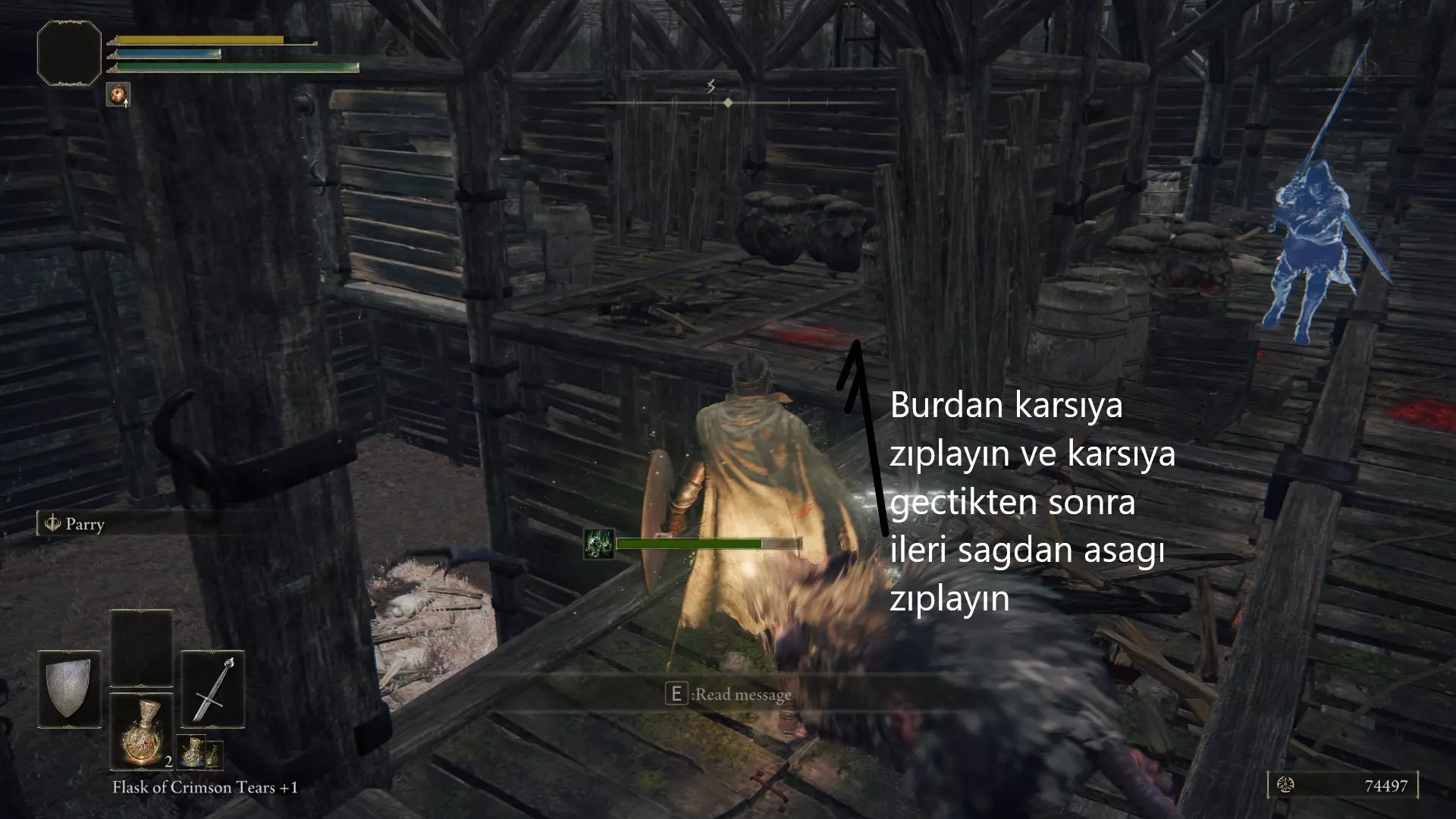在你当前所在的位置,从高处往下看可以看到一座桥。从那座桥过去,不要与龙发生任何战斗,然后向右继续前进。往前走,在世界树的后面有气流,借助气流向上跳跃。从这里继续朝着城堡前进,打开大门进入城堡。在这里,你需要动作快一些,否则很容易死亡。进入城堡后,从前方左转,然后直走,快速爬上楼梯(这里的生物会让你中毒)。爬上楼梯后,你会在对面的箱子里拿到一个两部分组成的勋章中的一部分。这些勋章是后续你想要开启某个区域的关键物品。接下来从塔上跳下去,再从图片所示的位置往下跳,在这里拿到拉达冈的糜烂烙印,然后去打龙,开始收集卢恩。