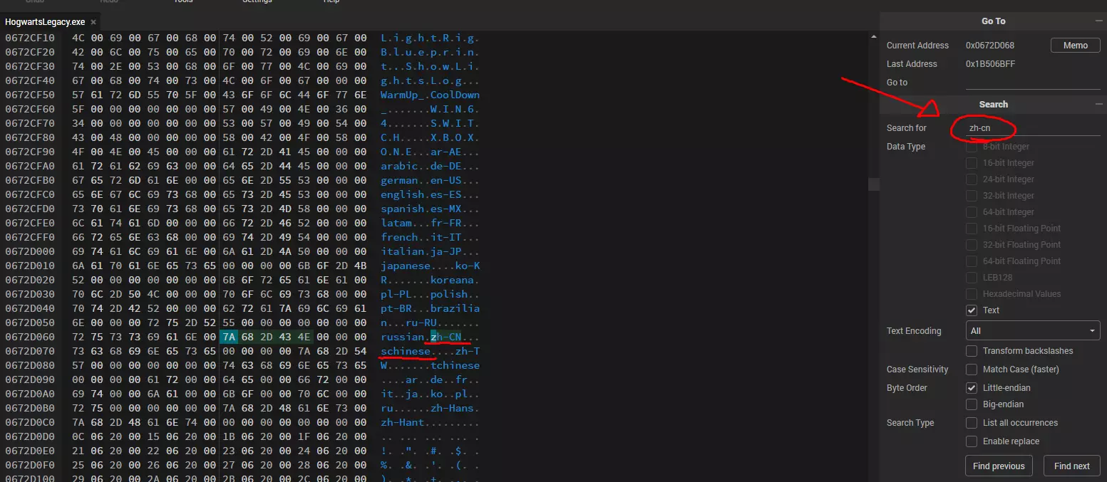 注意:为安全起见,请复制一份“Hogwarts Legacy.exe”文件 葡萄牙语字幕 现在找到“Hogwarts Legacy.exe”文件并将其拖到HexEdit网站,然后搜索“zh-cn”