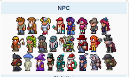 获得你世界中所有可用的NPC。 入住下方图片中显示的所有NPC,但不包括最后4个(不过如果你在圣诞节期间游玩,还需要圣诞老人,击败雪之军团后出现)。