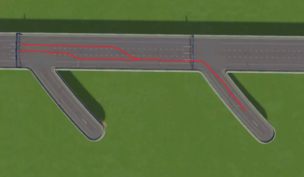 如果你使用没有高度的高速公路,仍然可以通过将六车道道路架高越过高速公路,然后再降低下来的方式实现。但我觉得这样看起来很奇怪。把高速公路架高会更好、更自然,对吧? 编辑:我知道在我推荐的高速公路和六车道道路的连接方式中,高速公路没有架高。我已经制作了一个完全相同的资产,只是高速公路是架高的。我已经请求原模组作者允许我在个人主页发布该资产,但尚未得到回复。