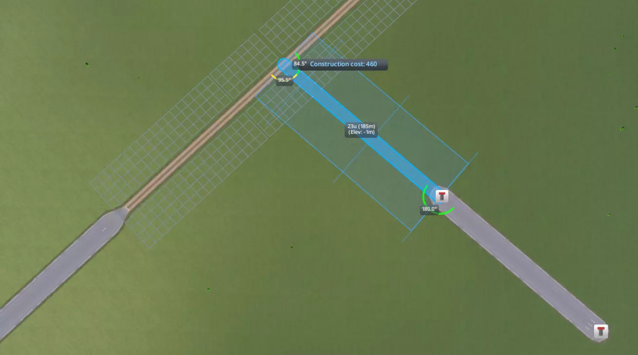 我之前提到过,弯曲的高速公路从砾石路的交叉口开始修建,是因为绘制好高速公路后,无需调整其方向。但在某些情况下,尤其是角度较小时,你需要从直道开始修建弯曲的高速公路,使其保持平行,这时就需要调整方向。总之,从直道开始修建弯曲的高速公路,能确保道路始终平行,但需要调整方向;而从砾石路开始修建,在小角度情况下可能会导致道路不平行,但无需调整方向。