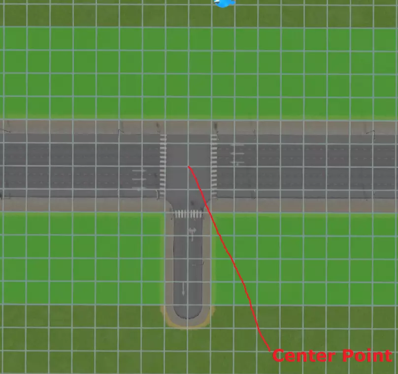 请注意交叉路口的中心点位置。现在,从你的中心点开始,向左数一格,向上数四格。记住那个点。然后使用曲线道路工具,从该点开始,向下移动两格,左键点击,然后将其连接到交叉路口。希望这两张图片能有所帮助。