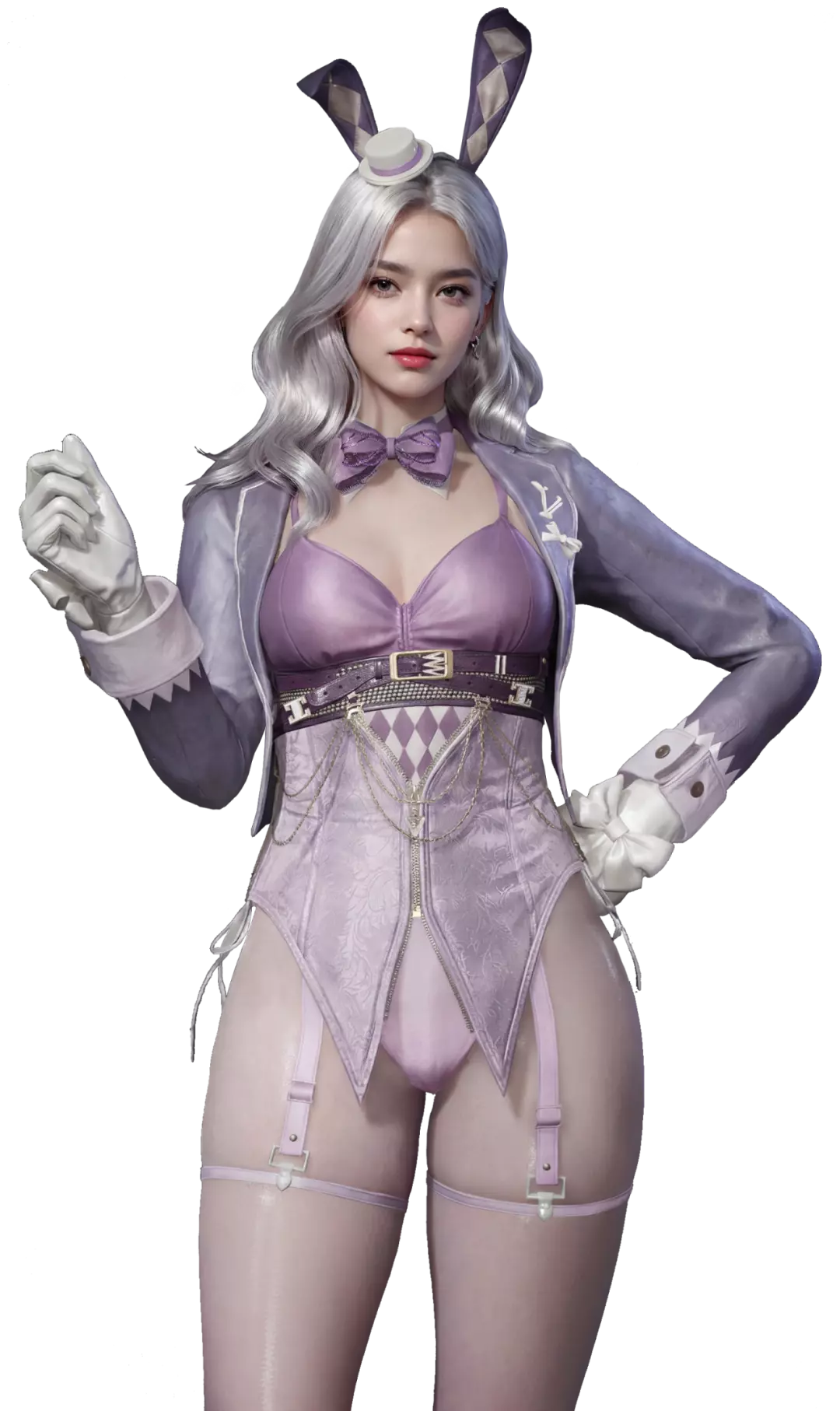 银色长卷发慵懒垂落,兔耳发饰魅惑点缀,俏皮又危险。领口的蝴蝶结精巧,腰部的皮质金属扣勾勒身形,紧身皮衣轻系丝结,在夜色中千面变换,鬼魅迷人。
