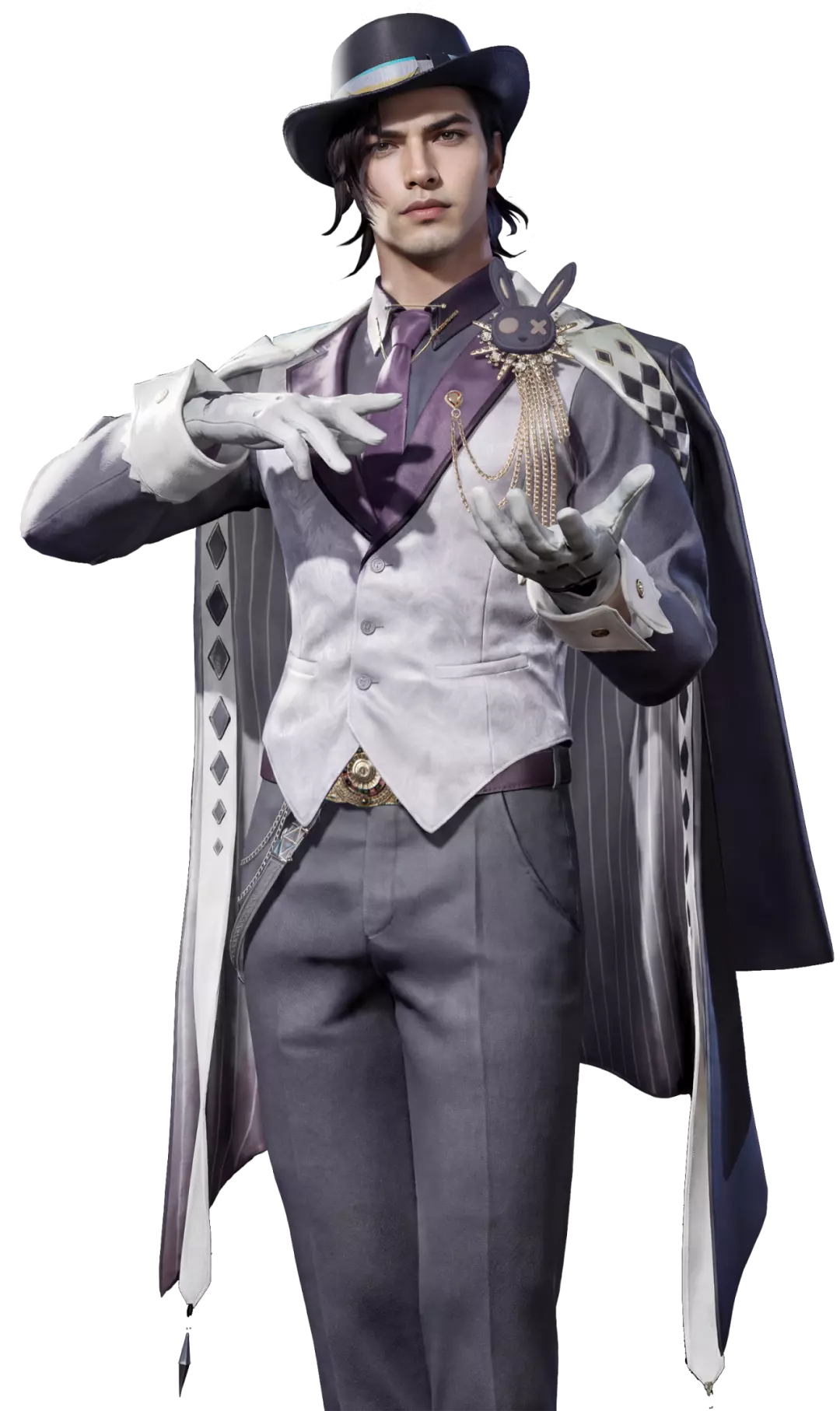 缎面礼帽与丝质领结添几分慵懒贵气,燕尾披风如夜色铺展,腰间丝丝链条垂落,让行走间自带细碎光泽,尽显千面幻术师的神秘与优雅。