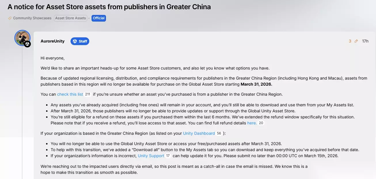 Unity宣布3月31日起终止中国大陆及港澳地区访问海外资源商店权限