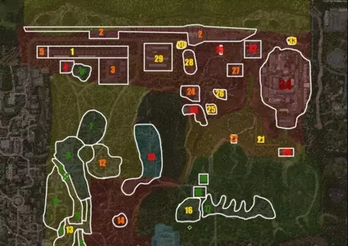 关卡美术团队需要拆除所有旧树木和草丛,更换所有技术资源,修复老旧地形,重做所有兴趣点,放置新的树木和草丛,然后优化PC端加载。 以下是需要特别注意的区域。颜色显示了每个地点未来的工作量。