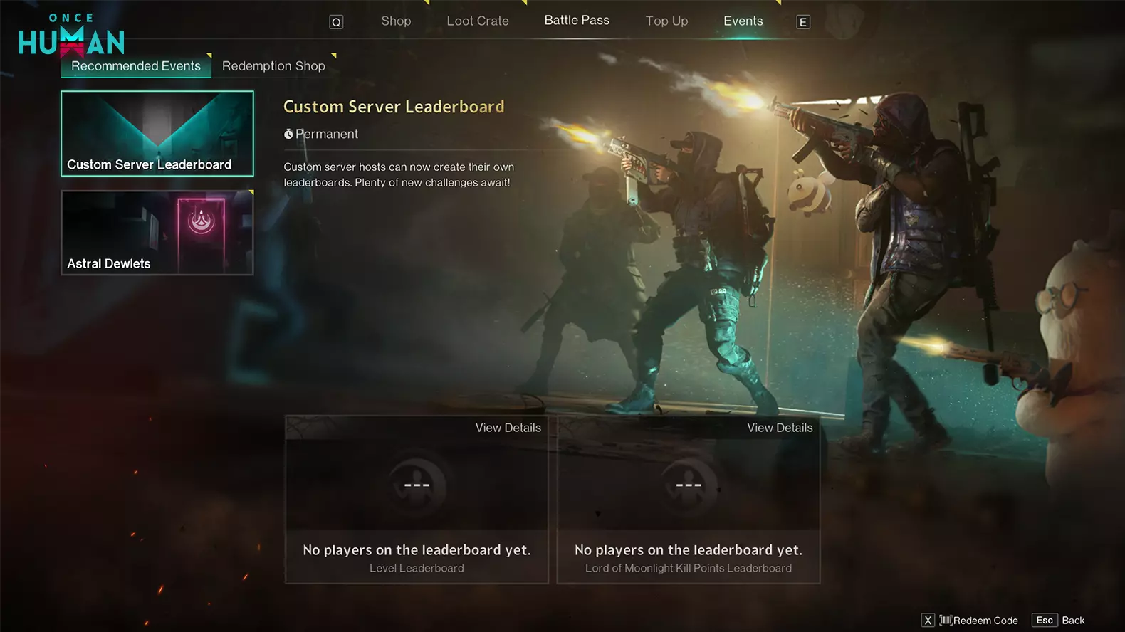 自定义服务器更新 【月光庆典】现已支持自定义参数 1. 可选择基于游戏内时间或现实时间触发月光庆典,并设置效果持续时长。 2. 可调整月光领主和狂怒变异体的基础属性,包括生命值倍率、伤害倍率、移动速度、仇恨范围及警觉灵敏度。 3. 可设置月神谕中特殊精英敌人的生成间隔和数量。 这些设置仅在带有月光庆典版本标签的服务器上可用。 自定义服务器【突袭区域】模式现已支持自定义参数 1. 可配置多个领地保护时段,并设置保护期间的建筑伤害减免。 2. 可自由调整建筑伤害倍率和腐蚀伤害倍率。 3你可以调整罗塞塔回声石传送器路线的开启时间、刷新间隔以及回声石 crate 的掉落数量。 4. 你可以在特定时间为所有玩家施加增益效果,并自定义增益持续时间。本次开放两种增益: 濒危狂怒:生命值越低,造成的伤害越高。 惯性失衡:降低重力和滑翔速度,增加负重,且坠落不会受伤或骨折。 这些设置仅适用于突袭区域模式服务器。 变异体掉落与功能系统更新 自定义变异体掉落:你可以为不同类型的变异体定义独特的掉落奖励和规则。 重生点优化:你可以为玩家设置特定的重生区域或精确的重生位置。非活跃角色保留:自定义服务器管理员可关闭自动角色删除功能,以保留非活跃角色。 新增自定义服务器排行榜 1. 管理员可自由设置排行榜类别、规则及奖励,组织排名挑战! 2. 管理员在服务器管理权限界面配置排行榜。其他玩家可在活动界面查看。