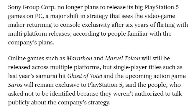 彭博社报道索尼重返独占,《羊蹄山之魂》等单机游戏不再移植PC