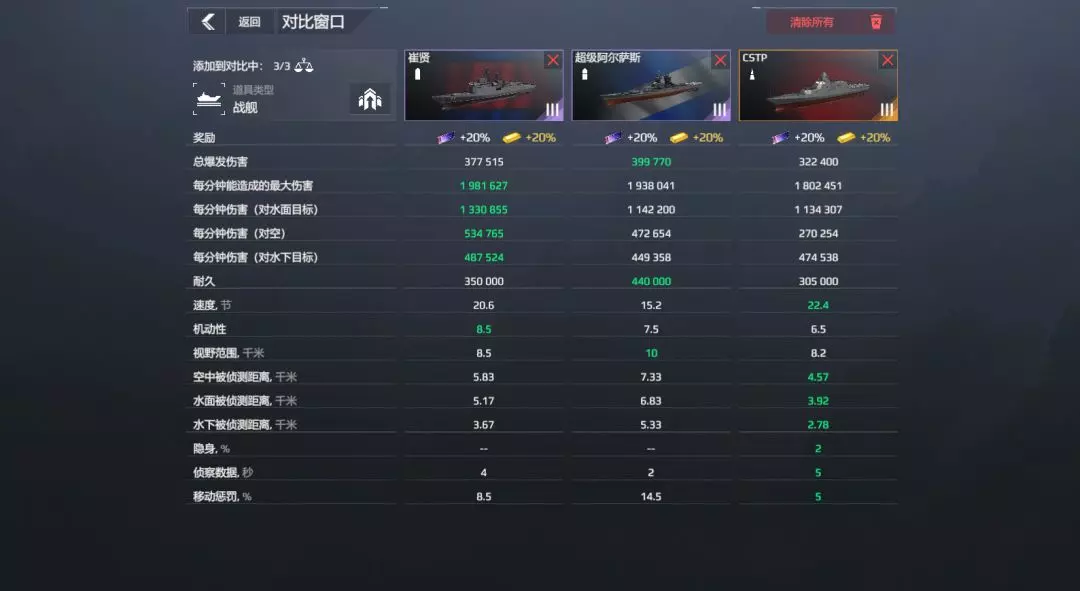 • 只能对比同一类型和阶级的道具。不同舰种的舰艇可相互对比。