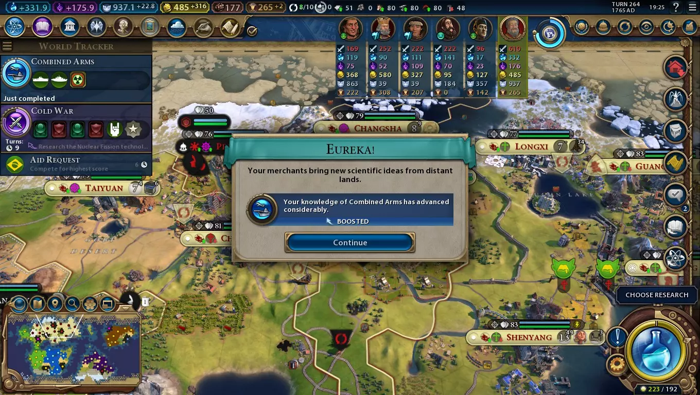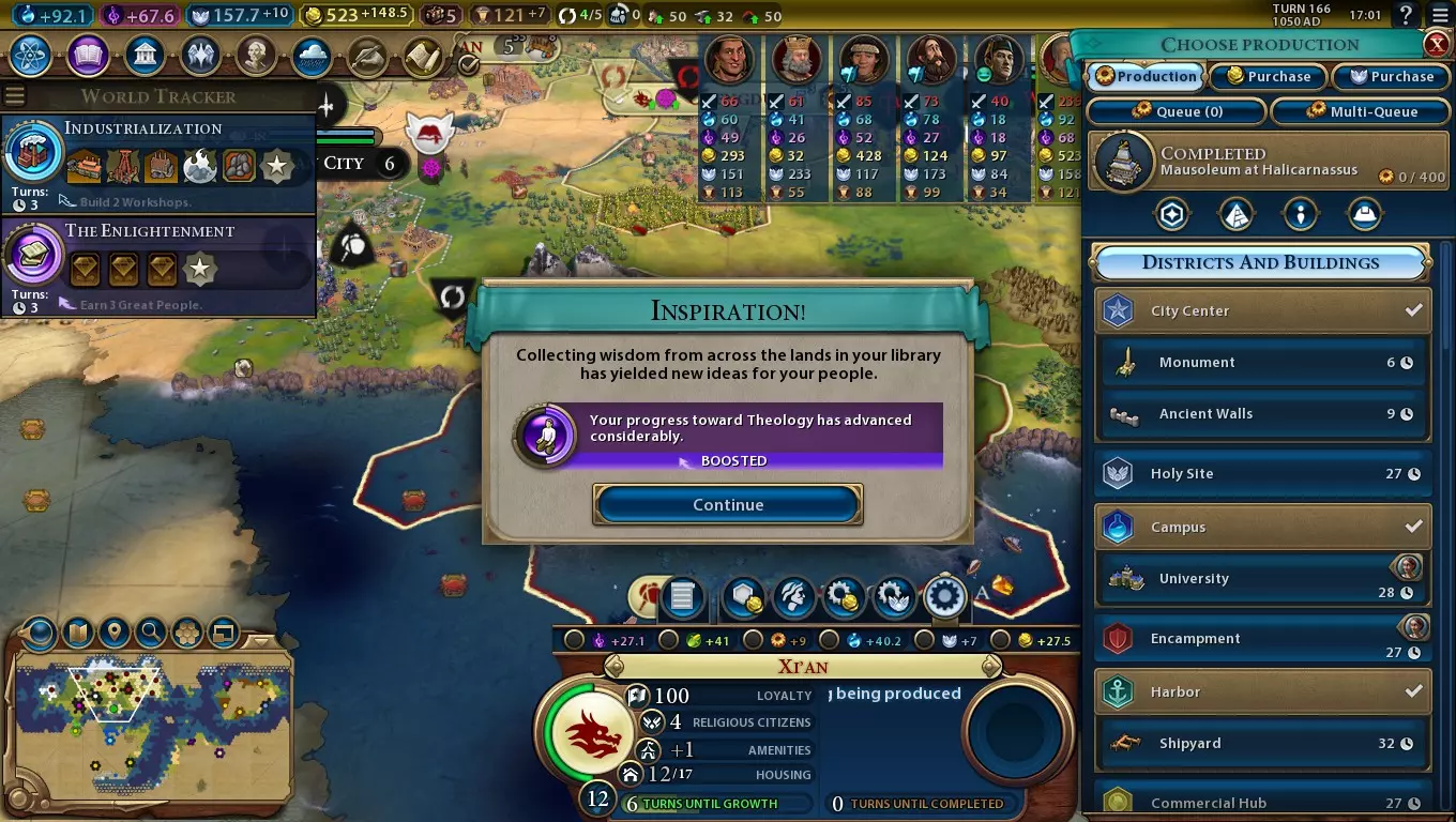 Won't take long to research these! Stronger Boosts - Mechanics Almost every technology and civic has an associated action which causes you to instantly research a chunk of it. If you are in the same game era as the technology, its worth 40% of the progress - making boosts important to the cultural game and even more so for scientific victories. Careful use of boosts can put you ahead of other civs even if your science/culture outputs are somewhat lacking. For China, chasing up boosts becomes even more important. As a good hypothetical example, imagine the game has just begun, and it takes 10 turns for both China and a competing civ to unlock Sailing. Both civs get the eureka. China needs only 5 turns to get the technology now, while the competing civ needs 6. China essentially gets a 17% reduction in the research cost, or to put it another way, a 20% science bonus! Technologies and civics become 20% cheaper if you are in a later game era than their corresponding era (e.g. researching Sailing in the classical era or later). Researching technologies and civics from later eras than the current game era will cause them to cost 20% more, stacking multiplicatively per era. However, the amount of science or culture from eurekas and inspirations respectively is fixed. This means boosts for research of earlier eras will cover more than 50% of the progress for China, but ones for later eras will cover less than 50%. Here is a table to show what the effective percentage of research is covered by boosts: Era Difference Technology Cost Boost Value Boost Value for China or Free Inquiry (technologies) or Pen, Brush and Voice (civics) Boost Value for China with Free Inquiry (technologies) or Pen, Brush and Voice (civics) -1 or more 80% 50% 62.5% 75% 0 100% 40% 50% 60% 1 120% 33.3% 41.7% 50% 2 144% 27.8% 34.7% 41.7% 3 172.8% 23.1% 28.9% 34.7% Though getting eurekas and inspirations ahead of time won't generate more or less science, they (and by extension the Chinese civ ability) has a bigger relative effect if you avoid researching too far ahead. The nature of Mandate Qin's leader ability discourages researching too far ahead early on, though later on you may want to consider whether it's better to spread out your research or beeline key technologies. Civilization Ability: Dynastic Cycle (Part 2/2) Stronger Boosts - Usage China's civ ability is particularly strong early in the game, when most eurekas and inspirations are relatively easy to unlock. Many are tied to Builder actions, and the fact you have an extra charge on every Builder helps get you these eureka/inspiration boosts even faster. It gets rather trickier into the middle of the game, where many boosts require use of specific units or unusual research orders. You can try researching technologies or civics to 50% completion and then switch to something else while you try to unlock their corresponding boosts, but this isn't always the best option. If you come across an important technology or civic with a tricky boost (Mass Media is a good example), don't feel you have to wait for the boost - just go ahead and research it. What to get the boost for and what not to can be a tricky The situation can vary substantially depending on how your game's going, but here are some general points to consider: Boosts dependent on Builder actions are generally easy to obtain. Early in the game, if you lack an appropriate resource type for the boost, you can usually settle a new city in range of it. Later on, that's not always possible, so getting the technology/civic without the boost is often a better option. Boosts dependent on constructing districts or buildings should be given special attention. Try to ensure all your cities have a diverse range of districts between them, and getting these boosts won't be too hard. Boosts dependent on specific units are a problem if you lack access to their respective strategic resources, but otherwise the Great Wall improvement provides enough gold that you generally should be able to afford to purchase some copies after a few turns. Eurekas dependent on the civic tree and inspirations dependent on the technology tree can vary considerably in difficulty, but on the whole if you keep your science and culture outputs reasonably balanced it should make the process much easier. Boosts dependent on Great People can be tricky and pretty unpredictable. Don't dedicate too much effort to picking them up unless they're Great People you'd want to obtain anyway (e.g. a Great Artist to help with cultural victory) or have enough spare gold to afford patronage. Boosts dependent on other civs like the ones for Writing and Defensive Tactics are highly unpredictable. Unless they're on an important research path, it can be worth holding off researching them for a while to increase the odds you'll get the boost. Some boosts you can find sneaky ways around. The Mobilisation inspiration (have three corps/fleets) for example can be worked around by simply making Warrior corps if you don't have a sufficient military to achieve that by other means. There's alternative means of gaining boosts as well, but you typically don't have so much control over them. Here's a list of those methods: Kublai Khan can use his leader ability - see that section for more details. Randomly from ancient ruins Various Great People (mostly Great Scientists); see the administration section of this guide for more information. The classical-era Great Library wonder (available at the Recorded History civic) grants you all ancient and classical-era eurekas and grants you more every time another civ generates a Great Scientist. This is one of the wonders you can rush with Builders thanks to Qin Shi Huang's leader ability. Having a level 2 or higher research alliance with another civ (requiring both civs to have the medieval-era Civil Service civic) will grant a new eureka every 20 turns. Spies can steal eurekas from other civs via the Steal Technology mission. Wu Zetian is pa