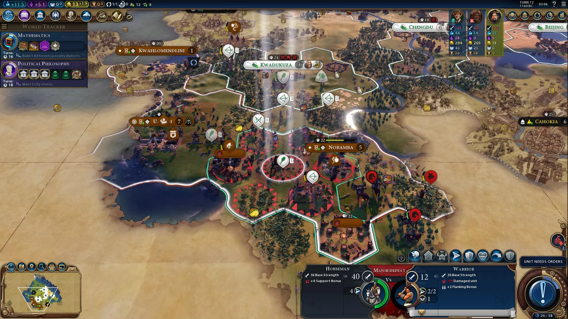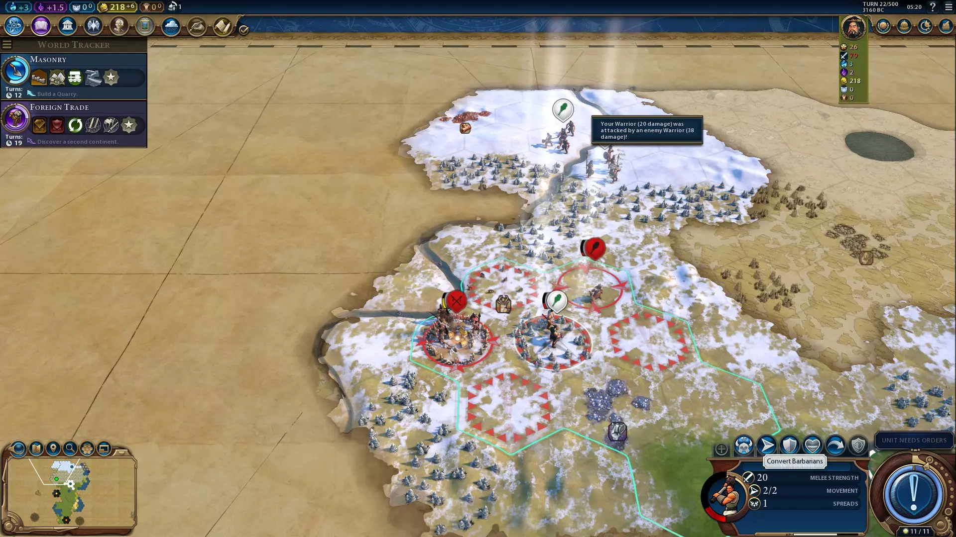 vs. naval units Deals -50% damage to city walls and urban defences Ignores Zone of Control Analysis These unique Barbarian units have a key advantage - the mobility of Scouts while matching up to the power of Warriors and Slingers. This makes them great at exploring, but there are some niche other applications. For example, because Barbarian Horsemen impose Zone of Control but ignore it from other units and cities, you can use them to easily surround an enemy city and put them under siege, preventing them from healing. In theory, the high mobility of these units could make them good pillagers on higher difficulties - assuming there's anything worth pillaging this early in the game. Barbarian Horsemen with the Depredation promotion can pillage two adjacent tiles in the same turn, granting you some decent yields or allowing the unit to heal up rapidly off enemy farms. The main disadvantage of these units is that they can never be upgraded - unlike any other unit you can get from Barbarians at this point in the game. As such, once classical-era units enter the battlefield, they have to be relegated to strictly non-combat roles. Making the Most of Warriors Warriors are great to use with Unifier Qin's leader ability because they're cheap. 40 production isn't much, while they have no resource requirement and no maintenance cost. However, they eventually obsolete, cutting out that easy option for cheap conversions. With careful management of strategic resources and technology, however, you can train Warriors much further into the game than normal, ensuring you can convert Barbarians for cheap for much longer! If you have the Iron Working technology and at least 20 iron, you will lose the option to train a Warrior. However, you can simply trade away your iron to another civ, and the option to create a Warrior will be there again. It's a good idea to purchase Warriors at this point in the game rather than to produce them, as cities will switch Warrior production to Swordsman production the moment you have 20 iron again. This trick continues to work if you have Apprenticeship (which unlocks Men-at-Arms units), but you will be completely unable to train Warriors once you have the Gunpowder technology. As a result, it can be worth avoiding researching Gunpowder until later in the game. As Warriors have only a mere 20 strength, they'll struggle to resist attacks by stronger Barbarians. As such, keep a stronger unit between your Warriors and the Barbarians you want to convert. You can then make the units swap places and use the Convert Barbarians charge on your Warrior immediately afterwards. That way, the only threats to your Warrior will be ranged attacks and flanking cavalry. Embarking Warriors is also a good way to keep them safe. Embarked units' defensive strength is defined independently of their unembarked strength. In other words, an embarked Warrior will defend just as well as an embarked Man-at-Arms. Prior to the renaissance, embarked units only have 15 strength, but once you have any renaissance-era technology or civic, that's boosted up to 30, and even higher in later eras. And, of course, you can escort embarked units with naval units for even better defence. To summarise, for the most efficient conversions, aside from getting the Hagia Sophia wonder you can hold off getting Gunpowder and sell your iron so you can train cheap Warriors. Unifier Qin's Leader Ability: Thirty-Six Strategems (Part 4/4) Barbarian Technology Barbarian technology scales based on the technology level of other civs in the game - how this happens is not exactly known. One theory is that Barbarians have the technology that half the full civs in the game have, yet you may notice that Babylon skipping ahead to later technologies can be enough to make Barbarians tougher. Until the exact details are known, you can assume that Barbarians will largely keep up with most civs' technological advancement. What makes this useful for Unifier Qin is it allows you to convert units that you otherwise the technology to train - such as Pike and Shot units before you unlock Metal Casting. Many military units in the renaissance, industrial and modern eras arrive at technologies on the bottom half of the technology tree, while many of the most relevant technologies to a scientific or cultural game are on the top half, so this means that a scientific or cultural Unifier Qin can cover the military weakness many other scientific/cultural leaders and civs can have at the same time. One catch with converting advanced units comes in the form of strategic resources. If you have no copies of the strategic resource a unit needs (e.g. horses for Horsemen), they will be unable to heal except when gaining new promotions. Later units like Infantry which consume resources every turn will additionally have a strength penalty for every strategic resource deficit (so if you have no oil and 10 Infantry, they will all have a 10 strength penalty). Now, let's take a step further into more specific mechanics regarding Barbarians... Advanced Strategies Barbarians are subject to certain hidden mechanics which affect when and where they spawn, and when they launch Raids. Understanding those can help you track down more Barbarians to convert! Barbarian Outpost Spawning Barbarian outposts have some relatively strict rules regarding how and where they appear. Outposts must spawn in territory not in line-of-sight of any civ, at least 7 tiles from another outpost, and at least 4 tiles from a city centre (this distance is increased from a player below Prince difficulty). They can spawn on any type of flat or hilly land terrain which is either featureless or has woods, rainforest, marsh, floodplains or volcanic soil. Barbarians cannot spawn on other features like geothermal fissures or natural wonders.