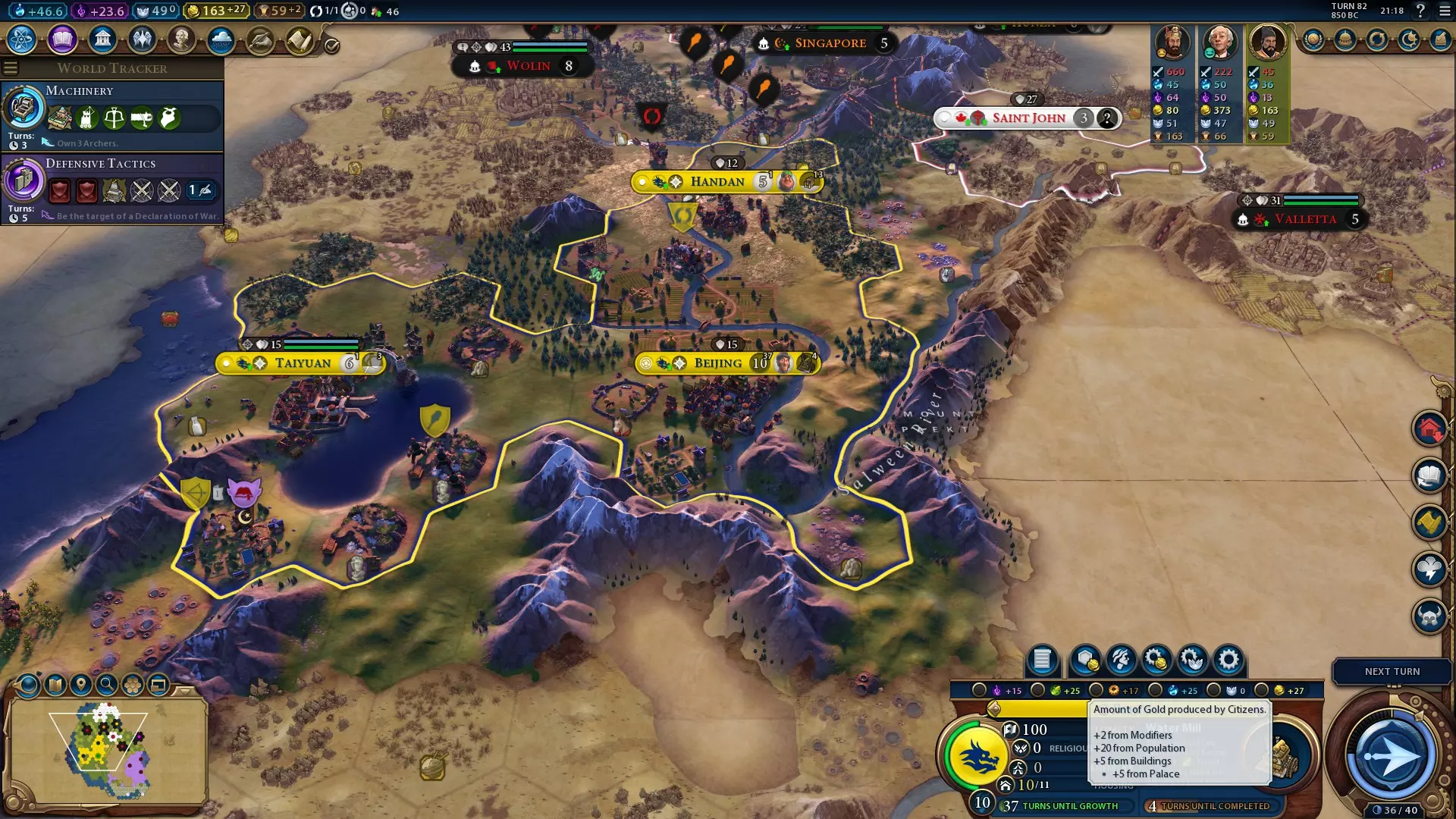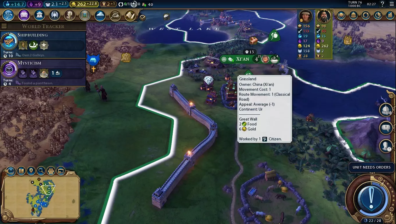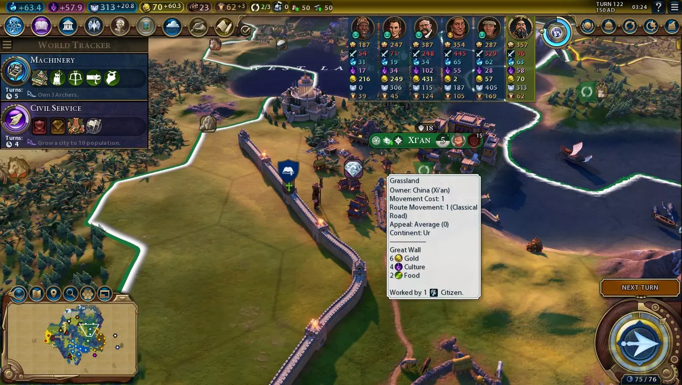 随着你的城市不断发展,你将能够更快地生成建造者,城市中也可能会有一些空闲市民。这时正是开始利用长城改良设施的好时机,它能提供大量金币,最终还能带来丰富的文化! 虽然长城改良设施潜力巨大,但也需要精心规划。长城片段只能建造在你领土边界的格子上,不能形成三角形,且每个长城格子旁边最多只能有两个其他长城格子。为了获得最大收益,你需要让一个长城格子至少与另外两个相邻,因此要获得第一个最优格子需要消耗三个建造者的建造次数。尽可能将长城段放置在距离城市中心三格远的位置,这样就不会干扰其他改良设施或区域的相邻加成。 初始用途 在考虑其产出之前,长城就有直接的防御用途——为在那里防御的单位提供+4战斗力加成。这比堡垒早整整三个时代可用,并且使用更经济的建造者次数,而非相对昂贵的军事工程师次数。在隘口处放置一段长城可以阻挡蛮族进入你的城市,并让敌军远离。拥有驻守晋升的陆地远程单位在长城上时也会获得+10战斗力——因此你的弓箭手将成为非常出色的防御者。在游戏初期拥有堡垒后,中国可以维持比大多数文明更小的军队规模,这样你就能将更多精力放在积累科技和文化加成以及建造奇观上。 防御方面的作用立竿见影,但一旦你有了多余的建造者次数,就可以开始建造连续的长城改良设施了。与至少两个其他长城相邻的长城 tiles 能提供可观的+6金币产出,这对于通过总督雷纳(财务官)的承包商晋升来快速生产单位、建筑甚至区域都非常有帮助。这也有助于单位升级——结合中国强大的科研能力,你可以不断更新自己的军事力量。长城的金币产出对【秦始皇】尤为重要,他凭借转化蛮族的能力,很可能在游戏早期获得大量单位。有了这项改良设施提供的金币,你可以轻松负担这些单位的维护费用,而且一旦研发出更先进的军事科技,就能有钱进行单位升级。 然而,【永乐帝】使用长城时需要更谨慎地平衡各项需求。长城既不提供住房也不增加食物,而永乐帝的优势在于让城市尽可能快速地发展到最大规模。此外,他的领袖能力已经能带来大量金币和文化,因此少建几块长城 tiles 的损失并不会太难弥补。因此,使用永乐帝时,通常应将长城的建造限制在那些难以用其他方式改良的 tiles 上(例如)苔原)、丘陵,或是那些种植农场也不会有太大区别的地块。文化与旅游