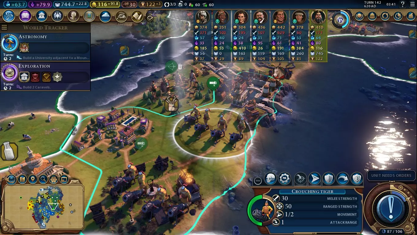 所有城市均可建造三个独特的【李家项目】。这些项目会将部分生产力转化为相应的产出。与其他城市项目不同,它们没有完成奖励。 【李家(信仰)】:城市每回合50%的生产力转化为信仰。 【李家(粮食)】:城市每回合50%的生产力转化为粮食。 【李家(金币)】:城市每回合100%的生产力转化为金币。 至少拥有10人口的城市,每点人口可获得+2金币、+1科技和+1文化。 这意味着10人口的城市将获得+20金币、+10科技和+10文化的额外奖励。 概述(第二部分/共两部分) 独特单位:【卧虎炮】