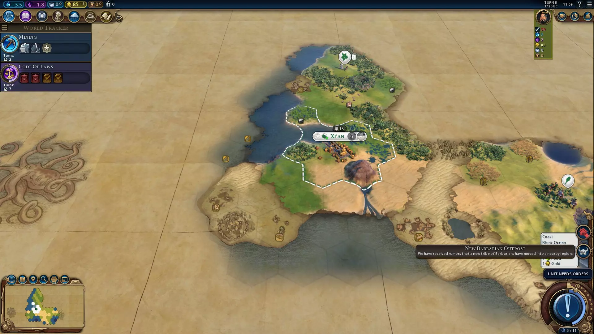 In the early stage of the game, random Barbarians getting in the way of your conquests is common - but for Unifier Qin, you can turn this into an advantage! In practice, however, Unifier Qin's ability to pull off an early rush will vary tremendously between games. If you start with few Barbarians near you, or your nearest neighbour is strong early on (e.g. the Aztecs, Gaul), attempting an early rush can end poorly. Instead, it may be worth simply emphasising Settlers and general city development instead. As more of the map fills up, Barbarian outposts can become harder to find. If possible, expanding near tundra/snow regions, or near desert can be helpful - civs are less likely to settle there, leaving gaps where Barbarians are more likely to spawn. Further into the game, the best place to find Barbarians is isolated islands, typically those found in snowy regions. As such, it's helpful to head towards the Shipbuilding technology reasonably early so you can bring Warriors over to them. Shipbuilding is needed for Buttress, in turn needed for the Hagia Sophia wonder, so it's very worthwhile on that basis as well. Barbarian units scale to the technology of full civs in the game, so as the game goes on they will produce increasingly strong units. This makes seeking out outposts still worthwhile late into the game to save production - particularly if one of your older, weaker melee infantry units can trade itself for a much stronger up-to-date unit. Once you reach the industrial-era Urbanisation civic, build a Neighbourhood in a key city, preferably away from any key districts or tile improvements. Place a melee infantry unit or two by it, and ensure you don't have a Spy protecting it. That way, if other civs target the Neighbourhood for a Recruit Partisans mission on that city, you'll easily be able to convert the Barbarian anti-cavalry units the mission creates. Basic Strategy Conclusion Ultimately, Unifier Qin's leader ability can be used to support early rushes, but otherwise is mostly useful to save production when it comes to securing up-to-date defensive units. A reasonable strategy is to start off aggressive in the first two eras, but settle down into a scientific or cultural playstyle for the rest of the game. It's a shame to leave things there though. After all, if you want to play a typical scientific/cultural game as China, there's four other leaders that can do that just as well. So, let's look more in-depth into how this whole ability can be used more effectively... Unifier Qin's Leader Ability: Thirty-Six Strategems (Part 2/4) Intermediate Strategies and Tricks Unifier Qin's leader ability can be simply used to convert Barbarian incursions into opportunities for extra units, but you can get even more out of it if you get the hang of how Barbarians work. Outpost Tribe Types You may notice that not all Barbarian outposts spawn the same units. That's because there's actually three different types! Melee Tribe - The most common. These start with a recon unit (initially a Scout), and will spawn a new unit every 15 turns. 25% of these regularly spawned units will be ranged land units, but otherwise it largely spawns melee infantry units, and can spawn extra recon units. Very, very late in the game these can spawn Giant Death Robots due to the way those units are coded. Cavalry Tribe - The rarest tribe type, and only appears near a horse strategic resource. These start with a Scout, and will spawn a new unit every 25 turns. Early in the game, 25% of these regularly spawned units will be either the unique Barbarian Horse Archer (earlier in the game), or a recon unit (starting with Skirmishers). Otherwise, these outposts largely spawn light cavalry units. Naval Tribe - These uniquely start with naval melee units, and will spawn a new unit every 10 turns. 25% of these regularly spawned units will be naval ranged units, but otherwise it largely spawns melee naval units.The type of tribe an outpost is also determines what units they create when they initiate a Barbarian Raid or Barbarian Attack - more on that later. Identifying the type of outpost tribe is fairly straightforward: If it spawns a Scout, or isn't adjacent to the coast, it can't be a naval tribe. If it spawns a naval unit, it is always a naval tribe. If it spawns a Warrior or Slinger, it is always a melee tribe. If it spawns cavalry units, it is always a cavalry tribe. Identifying the tribe of a camp is useful for ensuring you're always getting the most relevant units. Melee tribes are always useful as they produce melee infantry units, which when converted can be used for further conversions. Cavalry tribes are generally bad at the start of the game because the unique Barbarian Horseman and Barbarian Horse Archer units they spawn are weak and cannot be upgraded, but once they start producing proper Horsemen they become considerably better. Naval tribes are good in the very earliest turns of the game as they can secure you an early naval unit and the associated era score. Later on, you can use an embarked Warrior protected by a stronger naval unit to get close, allowing you to safely convert units with a much lower risk of your Warrior being killed. Raids and Attacks Barbarian outposts always spawn with a recon unit (for melee and cavalry tribes) or a naval melee unit (for naval tribes). If these reach a tile adjacent to a non-city-state city, and then return to their original outpost, they will cause a Barbarian Raid to occur. When a Barbarian Raid starts, the outpost will cause new units to be spawned every 2 turns (or every turn on Immortal/Deity difficulty) until all the raid units are produced. Depending on the tribe of the camp and your game's difficulty, that can be between 1 and 5 units, as follows: Tribe Settler to Chieftain Warlord to Emperor Immortal to Deity Melee 2 melee infantry 2 melee infantry 1 land ranged 3 melee infantry 2 land ranged Cavalry 1 light cavalry 2 light cavalry 1 mobile ranged* 3 light cavalry 2