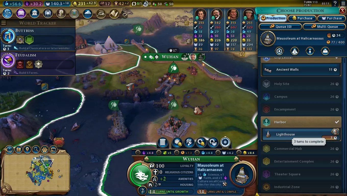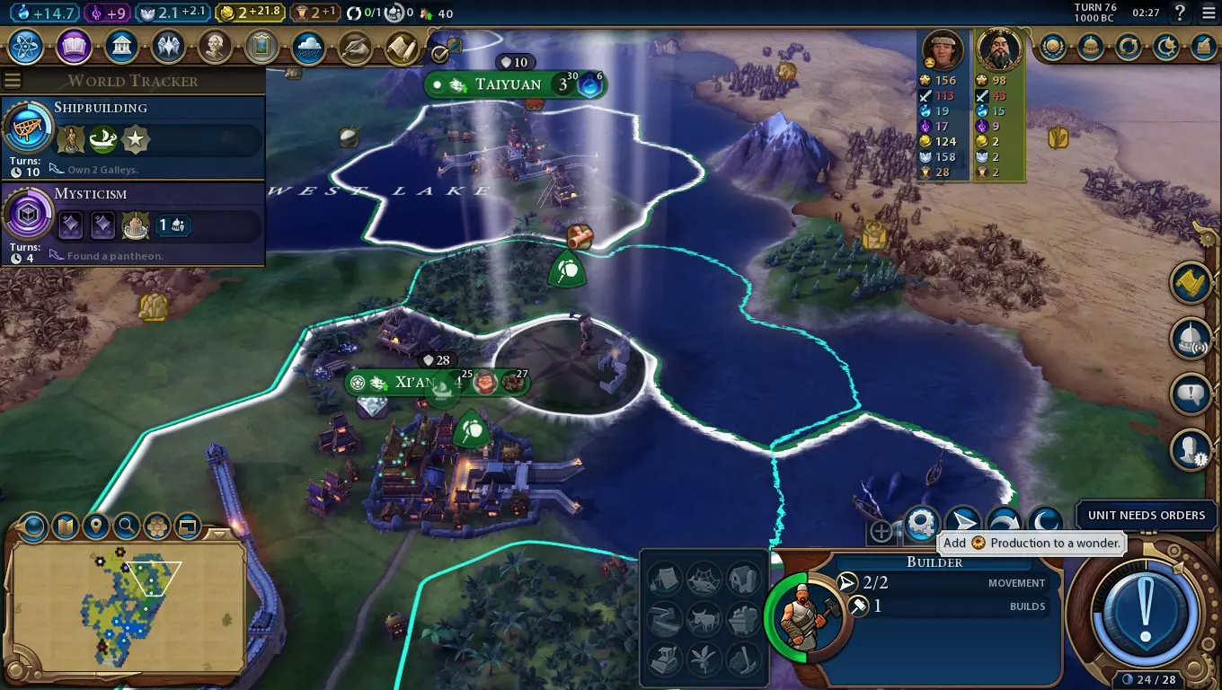 But why stop at just two items? By switching my city between working on two wonders and a building, I can develop the wonders with Builders while using the city's production to help develop itself. I'm essentially building three things at once! As Builder charges are almost always cheaper than 15% of the cost of a wonder, it's not a bad idea to use this trick to train Builders in cities that also have wonders in progress. You can go beyond the normal 15% of wonder costs by using bonuses that boost wonder production (or modifiers to general production, but they arrive too late to be relevant). Key ones include: (Pantheon) Monument to the Gods: +15% production boost to ancient and classical-era wonders. This makes every Builder charge worth an extra 2.25% of ancient/classical wonder costs. (Government) Autocracy: +10% bonus to wonder construction. This makes every Builder charge worth an extra 1.5% of ancient/classical wonder costs. (Policy Card) Corvée: +15% production boost to ancient and classical-era wonders. This makes every Builder charge worth an extra 2.25% of ancient/classical wonder costs. (City-State) Brussels: +15% production bonus to all wonders if you are suzerain. This makes every Builder charge worth an extra 2.25% of ancient/classical wonder costs. (Natural Wonder) Ik-Kil: +50% wonder construction in adjacent tiles. The bonuses from Monument of the Gods and Corvée are the most consistent. Brussels and Ik-Kil won't appear in every game and the former's suzerain bonus may be hard to secure. Rushing Wonders - The List Now that the mechanics are out of the way, let's consider the wonders themselves. Here's a list of all ancient and classical era wonders in a rough chronological order. Great Bath Requires the ancient-era Pottery technology. Must be constructed on a floodplains tile. +3 housing and +1 amenity in this city. Floodplains along the river this wonder is on are immune to flooding damage but produce 50% less food and production bonuses from floods. Floodplains belonging to this city gain +1 faith every time flood damage is mitigated. The Great Bath's extremely early arrival makes it extremely competitive, and more to the point it means you have to dedicate time on it rather than early expansion. It's generally not worth it to build this wonder as the lost expansion time will cost you down the line. Stonehenge Requires the ancient-era Astrology technology. Must be constructed on flat land adjacent to stone. +2 faith. Free Great Prophet and may found a religion on Stonehenge. The temptation of an early free religion is great, but even with China's ability to rush wonders it's a hard one to pick up. Still, if you manage it, you can grab the Divine Inspiration belief and enjoy a strong early faith output. Etemenanki Requires the ancient-era, Writing technology. Must be constructed on floodplains or marsh. +2 science. +1 science and +1 production to all floodplains in this city, +2 science and +1 production to all marsh tiles in your empire. The boosted science output is powerful with China's civ ability, and finding a city with a few floodplain tiles isn't too hard. Writing is a high-priority technology for most civs, so act fast to maximise your chances of getting the wonder. Hanging Gardens Requires the ancient-era Irrigation technology. Must be constructed adjacent to a river. +15% growth in all cities, and +2 housing in this city. Requiring two technologies rather than Stonehenge's one, the Hanging Gardens is a little less competitive on higher difficulties - though it can still be a gamble. Larger cities are ideal for building post-classical era wonders. Temple of Artemis Requires the ancient-era Archery technology. Must be constructed adjacent to a camp improvement. +4 food and +3 housing in this city, in addition to +1 amenity per camp, pasture or plantation within four tiles of this wonder. A great wonder for developing a strong early city. If you can manage to get it and Petra in a desert hills city, it'll have both the size and production capable of building many post-classical wonders. The technology's also useful for keeping your civ defended, so there's no problem with picking it up early. Great Pyramids Requires the ancient-era Masonry technology. Must be constructed on a desert or floodplains tile without hills. +2 culture. Grants 1 free Builder, all Builders receive +1 charge. One of the best early wonders for China, an extra Builder charge will help you build future wonders even faster. The free Builder from this wonder will be enough to help you get 75% of another wonder built, or 90% with Governor Liang (the Surveyor). There is the problem you need to track down desert land, but you'll often be able to get at least one tile by your second or third city. Mandate Qin's Leader Ability: The First Emperor (Part 2/4) Oracle Requires the ancient-era Mysticism civic. Must be constructed on hills. All districts in this city produce +2 Great Person Points of their corresponding type (Theatre Squares only produce Great Writer Points). Patronage of Great People via faith costs 25% less. A reasonable wonder which is particularly good in large cities that can support a large variety of districts. Qin's China doesn't get any direct bonuses to faith output, so the cheap patronage is a fairly niche bonus. Great Lighthouse Requires the classical-era Celestial Navigation technology. Must be constructed on the coast (not a lake), adjacent to a Harbour district containing a Lighthouse. +3 gold and +1 Great Admiral Point per turn. All naval units gain +1 movement. Mainly useful for water-heavy maps, though in a region with high potential for canals it can be quite helpful for defending your lands as well. Its relatively high positioning requirements make it a pretty uncompetitive wonder which means you can pick it up some way into the game. That's helpful if you want to plan around maximising Theatre Square adjacency. Jebel Barkal Requires the classical-era Iron Working tec