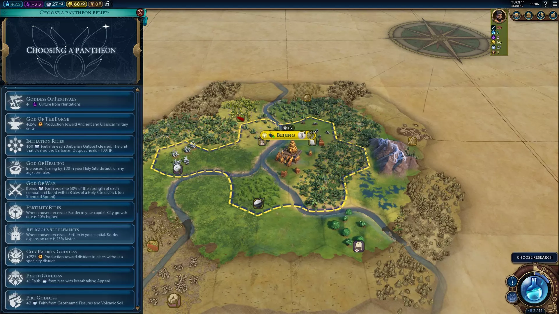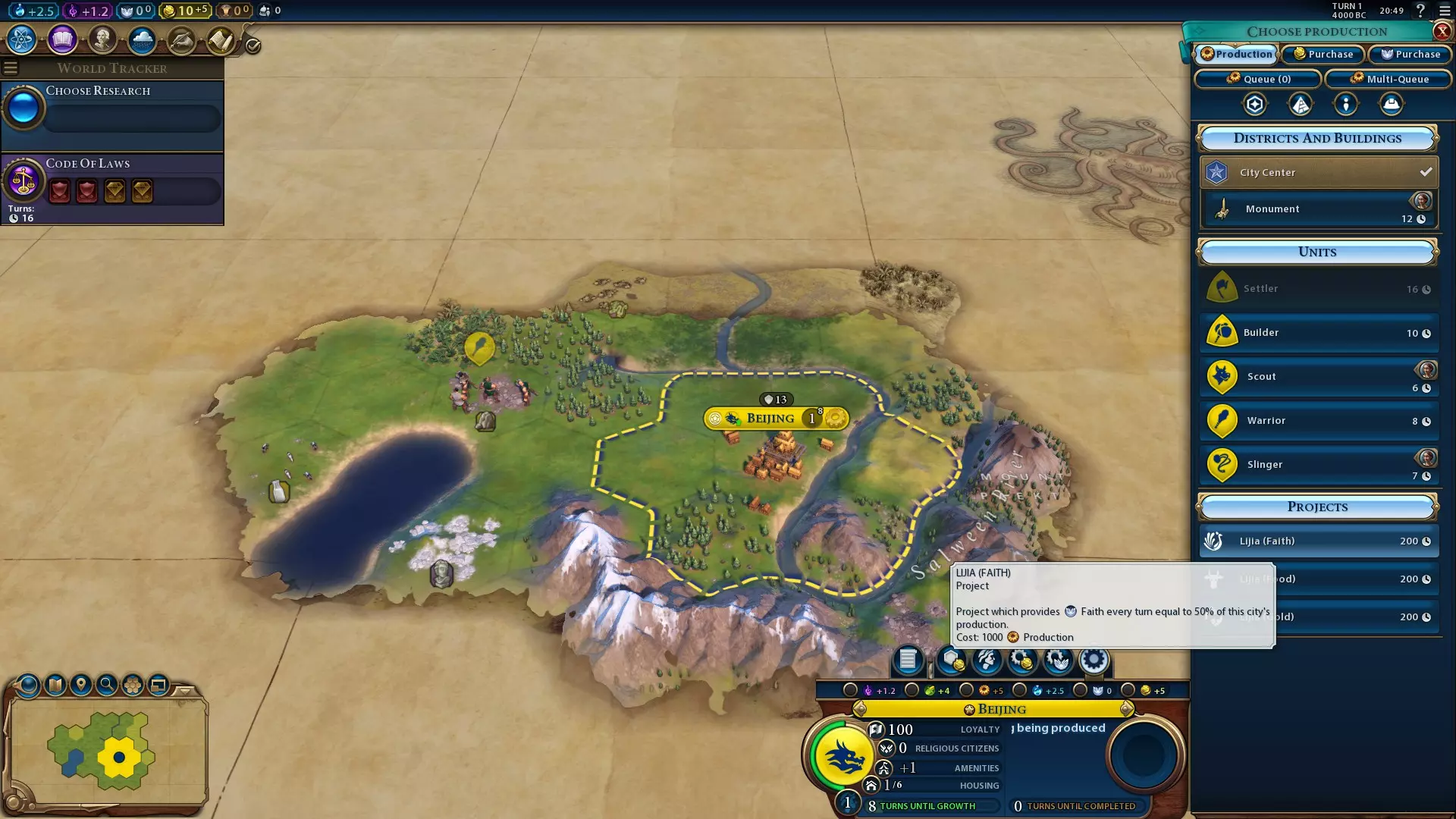 从第一回合开始,你就可以在首都使用【礼甲(信仰)】项目将生产力转化为信仰值。这能让你非常早地获得万神殿——【宗教定居者】是个不错的选择,它能提供额外的移民,节省你宝贵的早期生产力,还能避免首都损失1点人口。获得万神殿后,你可以转而训练一两个投石兵用于防御,并训练移民来建立第三座城市。