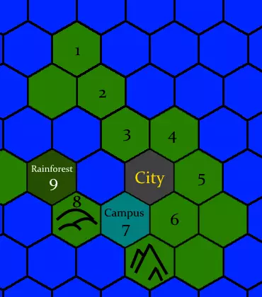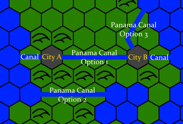 这座城市位于一个蜿蜒的岛屿上,但并非所有潜在地点都能建造运河。 地点1无法建造运河,因为其仅有一侧存在陆地瓷砖(而非两侧都有)。 地点2可以建造运河——其两端均为水域,且两侧都有陆地——但前提是地点3尚未建造运河。 地点3可以建造运河(但前提是地点2或地点4均未建造运河)。城市中心被视为水域瓷砖,而非其他运河。 地点4可以在地点3或地点5未建造运河的情况下建造运河;地点5可以在地点4未建造运河且地点6未建造巴拿马运河的情况下建造运河。 地点6无法建造普通运河,但理论上可以在那里建造巴拿马运河奇观,以将城市与东南部的水域连接起来,前提是地点5未被占用。位置7无法建造运河,因为该位置已存在一个区域。 位置8无法建造运河,因为其地形并非平坦。 位置9在拥有青铜工作技术后可以建造运河。在此处建造运河将移除雨林。 运河的建造成本比特色区域高50%,但可以通过使用军事工程师为其提供建造次数来部分抵消这一费用,类似于秦始皇的【天命】允许建造者为在建奇观增加建造次数。每次建造次数可抵消运河总造价的20%。除了允许海军单位通过该地格外,运河还具有一些额外效果: 国际商人每经过一个运河地格可获得+1金币,并且在计算运输效率时将运河地格视为水域(为贸易路线增加额外金币——更多信息请参见《印加文明指南》中的“机制 - 运输效率”部分)。 工业区每相邻一个运河可获得+2生产力。 拥有“水利工程”晋升的梁总督(勘测者),其城市中的每条运河可提供+1宜居度。 研究工业时代的“蒸汽动力”科技后,将有机会建造奇观“巴拿马运河”。它的功能类似于长度为两到三格的运河,能够让你将两个城市中心连接起来,或者在无需中间城市的情况下连接相距三格的水域。