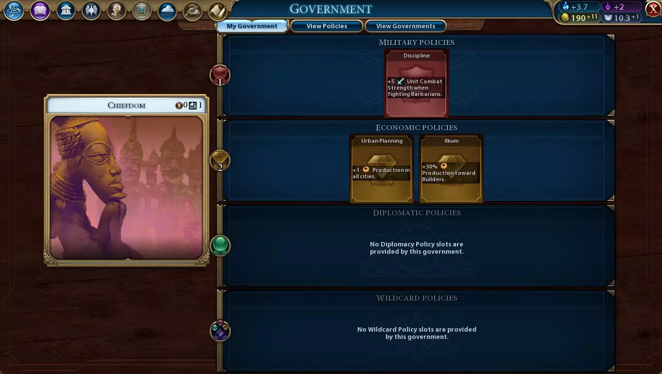 Crouching Tiger Cannons offer an alternative option to Crossbowmen in medieval and renaissance-era warfare. While they can't be prebuilt, have a shorter range, and don't count towards the Metal Casting eureka, they're cheap to train and have a considerably higher damage output. Defensive Usage The main role of Crouching TIger Cannons is in defence. Positioned on a city centre or Encampment district, they can deal their full damage to adjacent attackers without having to risk being attacked directly. Alternatively, you can position them on Great Wall tiles to partially cover their defensive weaknesses - with the Garrison promotion, those spots are particularly effective in defence (especially if they're also on hills). If out in the open, Crouching Tiger Cannons shouldn't be left vulnerable. Have a front line of units that defend more effectively, such as Knights - that way, the Knight can move out the way, the Crouching Tiger Cannon can move forward to fire, and the Knight can finish off the enemy unit, occupying the tile. To put it in other words, Crouching Tiger Cannons work best when getting the first hit on a unit to set up other units to get the last. It's also worth noting the attack strength of your cities with walls (or urban defences at the modern-era Steel technology) is tied to the highest ranged strength of any military unit you control. As such, your first Crouching Tiger Cannon will substantially boost your cities' ranged attacks. Offensive Usage Against cities without walls, Crouching Tiger Cannons perform about on a par with Catapults, and defend considerably more effectively. While the units have a 50% damage penalty against city walls relative to Catapults, the ability to move and fire in the same turn provides some mobility that Catapults lack, only at the expense of range. And if any enemy units come into range, Crouching Tiger Cannons are considerably better at dealing with them than Catapults are. However, this is a niche application with a small window of usage. Bombards defend better than Crouching Tiger Cannons, and deal considerably more damage against cities. Crouching Tiger Cannons' low defence and limited range makes them easily killed by Men-at-Arms. And while Crossbowmen might not deal a lot of damage against cities per unit, their higher range means you can get a lot more attacks in per turn. Obsoletion Crouching Tiger Cannons won't perform very well against industrial-era cavalry units like Cavalry and Cuirassiers - they can be killed by them in just one turn! Thankfully, gold from Great Wall improvements will make the upgrade to Field Cannons affordable. They have both better strength and better range. Conclusion Crouching Tiger Cannons should be considered an alternative to, not a replacement to, Crossbowmen. They're not vital to a game as China and there's no great loss if you only ever train one for the +4 era score all unique units offer. If you do choose to train a few, they're best-used in conjunction with the Great Wall, city centres or Encampments to defend your cities from would-be invaders. Administration - Government Note that the Administration sections strictly cover the options that have particularly good synergy with the civ's uniques. These are not necessarily the best choices, but rather options you should consider more than usual if playing this civ relative to others. Government Tier One Classical Republic is a good starting choice for Kublai Khan, Wu Zetian and especially Yongle due to the good array of economic policy cards and reliable passive bonuses. The housing and amenities in particular goes well with Yongle's leader ability. Mandate Qin may instead want to exploit Autocracy's wonder construction bonus. As for Unifier Qin, Autocracy's strength bonus keeps melee infantry units safe so they can get closer to Barbarians to conver them, and makes the ones you do convert stronger. The Audience Chamber is the best option for Yongle and reliably good for most other leaders. Still, the Ancestral Hall is good if there's plenty of land to expand into. Unifier Qin should take the Warlord's Throne unless there's no good targets to invade with his converted units. Tier Two Merchant Republic is a reliable choice that serves both cultural and scientific victories well due to its good selection of policy cards. However, Monarchy can be unlocked considerably faster making it ideal for Wu Zetain (to unlock the Intelligence Agency faster), and its housing bonuses are helpful for Yongle, but it's still a good choice for anyone else. Complement the government with the Intelligence Agency so you can steal eurekas from other civs more effectively. Tier Three Democracy is a safe choice for cultural victories owing to its high quantity of economic policy cards. For a scientific game, go with Communism. If you're still going for domination with Unifier Qin, take Fascism. A cultural China will want to complement their government with the National History Museum, but a scientific-oriented China will prefer the Royal Society. Mandate Qin's leader ability means that you'll have more charges on Builders, and hence get more production out of every one sent to rush space projects. For a domination game, take the War Department. Tier Four Digital Democracy is generally your best choice in a cultural game, while Synthetic Technocracy is especially good for aiding in scientific victories. For a domination game, take Corporate Libertarianism unless you really need science, in which case take Synthetic Technocracy. Administration - Policy Cards Policy Cards Ancient Era (Unifier Qin) Agoge (Military, requires Craftsmanship) - Warriors are already cheap to train, but with this policy card you can produce them even faster - and therefore get more charges to convert Barbarians with. (Unifier Qin) Conscription (Military, requires State Workforce) - Converting a lot of Barbarians early on can cost a lot in unit maintenance. Cutting that cost frees up a lot of gold for mo