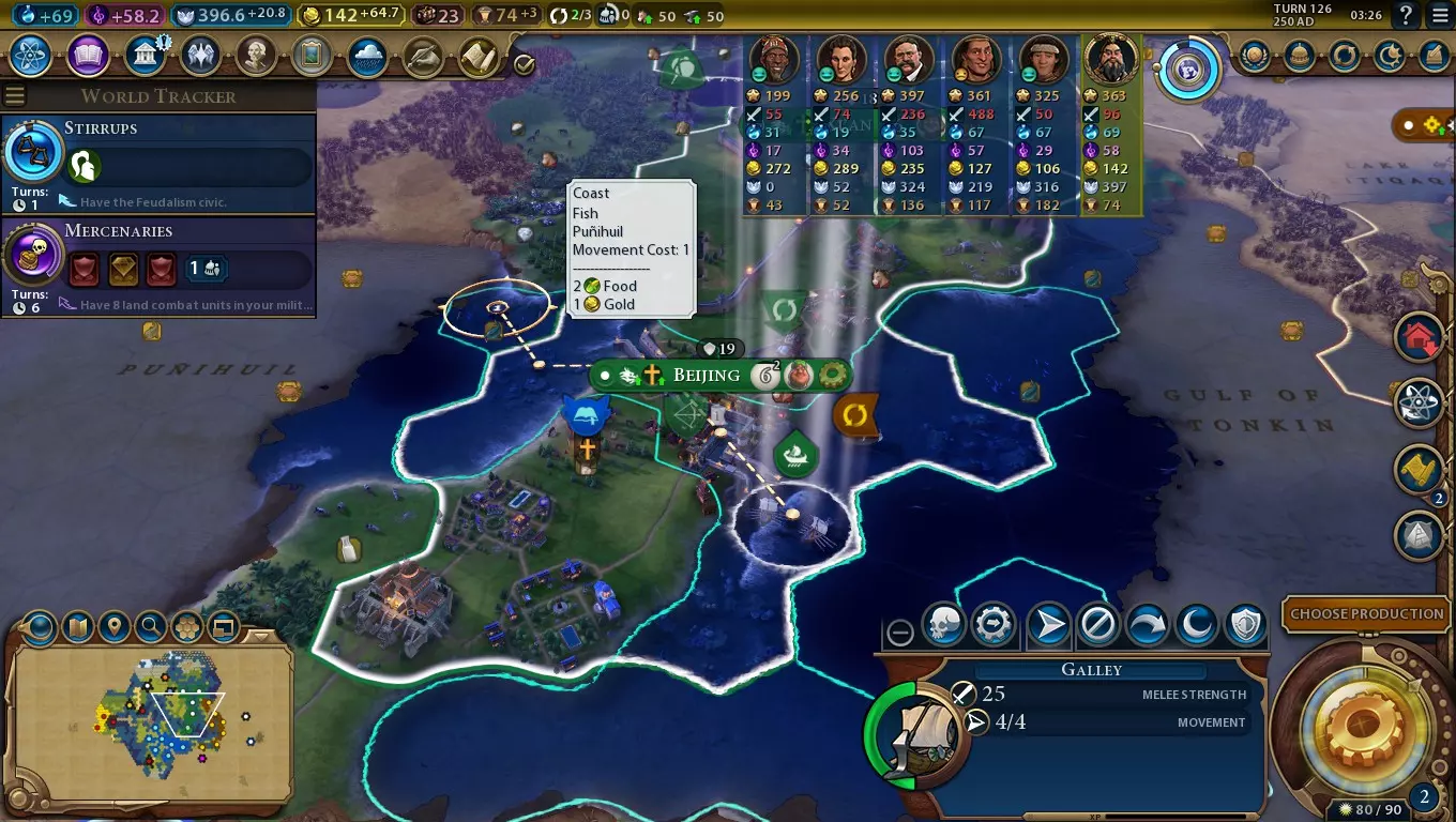 你可以通过向城市派遣贸易路线并确保其在到期前保持活跃,从而在该城市建立贸易站。贸易路线至少需要21回合才能完成。 对于忽必烈,在其他文明的城市建立首个贸易站将为你提供一个随机的免费尤里卡和灵感。游戏中的完整文明数量越多,你从这项能力中获得的潜在加成就越多,因此在较大的地图尺寸上,该能力往往更加强大。 早期向其他文明派遣贸易路线以获取额外加成的诱惑很大,但要考虑到许多早期的尤里卡和灵感相对容易获得。此外,国际贸易路线还面临被蛮族劫掠的风险,这会导致贸易站无法建立。另一方面,游戏后期的贸易路线完成时间会更长,具体取决于当前的世界时代: 世界时代 贸易路线完成最短时间 远古 古典 21回合 中世纪 文艺复兴 31回合 工业 现代 原子 41回合 信息 未来 51回合 因此,虽然通过该领袖能力有可能获得未来时代的尤里卡加成,但在游戏后期建立贸易站所需的时间过长,导致这一做法相当不切实际。一个不错的折衷方案是在中世纪或文艺复兴时代派出国际贸易路线。贸易路线的完成时间还不算太慢,不过很多科技和市政的提升条件都比较别扭(例如城堡、攻城战术、方帆、人文主义)。 结论 忽必烈的领袖能力简单易学且稳定可靠。对于想要学习如何扮演中国——甚至是学习文化或科技胜利玩法的玩家来说非常合适。只要记得在某个阶段向其他所有主要文明派遣国际贸易路线,就能轻松获得该能力的大部分收益。 秦始皇的领袖能力:始皇帝(1/4部分)