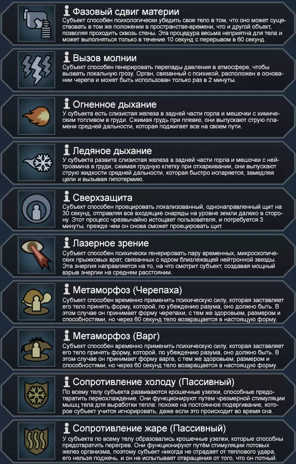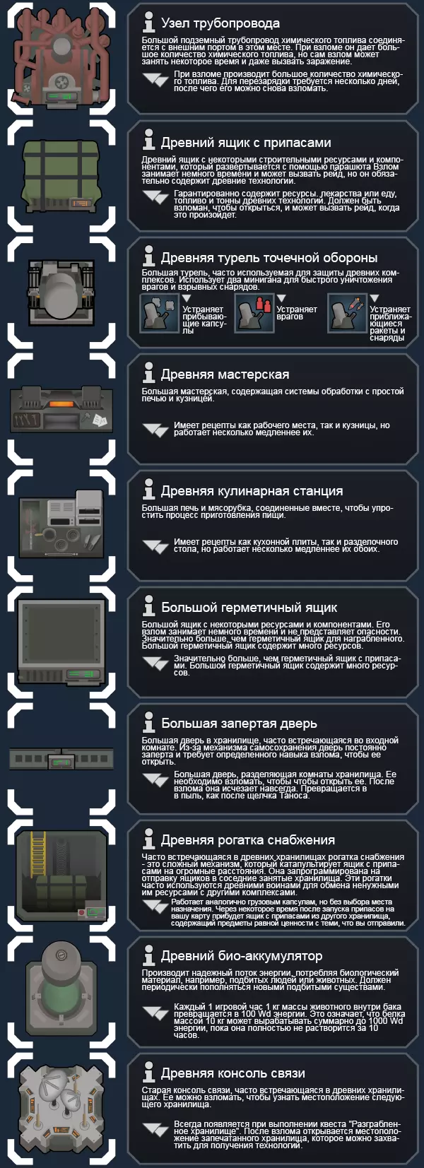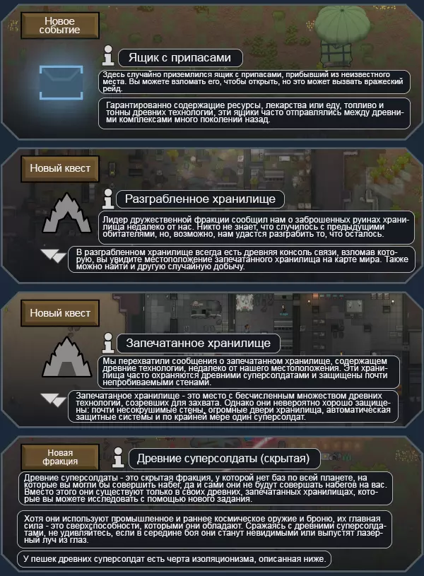 Послесловие и полезные ссылки "Change da world my final message. Goodbye!" Что ж, таким вот вышло данное руководство. Суммарно на данный проект у меня ушло более 15 часов - думаю, подобные цифры дадут вам понять, что я по-настоящему старался. Естественно, в руководстве могут быть ошибки, о которых я, дорогие читатели, прошу вас осведомить меня при обнаружении. Если вам понравился мой перевод, то знайте, что лучшая благодарность для меня - это благодарность авторам данной модификации. Все важные ссылки о них вы найдёте ниже: Основная страница Vanilla Factions Expanded - Ancients. Patreon авторов мода для материальной поддержки.[www.patreon.com] Другие работы авторов. Авторы: Oskar Potocki, художник и дизайнер, ответственный за большинство иллюстраций и визуальных образов, а также за дизайн мода. xrushha, программист, ответственный за xml мода. legodude17, программист, ответственный за код. Kikohi, программист, помогавший с CSG. Reann, писатель, ответственный за большое количество описаний. Следует также уделить внимание наиболее частым вопросам: ~~~~~~~~~~~~~~~~~~~~~~~~~~~~~~~~~~~~~~~~~~~~~~ В: Почему мне нужно Ideology DLC для этого мода? О: Потому что он непосредственно опирается на контент Древних, представленный в Ideology DLC. Он расширяет его различными новыми элементами хлама, а также взламываемыми структурами. Кроме того, новая фракция использует черту Изоляционист для своей идеологии, что также само по себе требует Ideology DLC. В: Совместим ли этот мод с Combat Extended? О: В комплекте с Combat Extended должен быть патч! В: Могу ли я отключить некоторые аспекты мода? О: Нет, он поставляется в комплекте. Вы либо принимаете все, либо ничего. Извините. Вы можете исправлять некоторые вещи, но я не могу обещать, что мод будет работать так, как задумано. В: Нужен ли мне базовый модуль, чтобы он работал? О: Для работы всех модов фракций требуется Vanilla Expanded Framework. В: Работает ли этот мод с другими модами? О: Должен, но, как я уже говорил в разделе "Известные проблемы", огромное количество кода, который нам пришлось связать с ванильным кодом, чтобы заставить его работать, может привести к ошибкам. Я не рекомендую добавлять этот мод в списки 300+ или 400+ модов, и мы не будем заниматься их устранением. В: Совместим ли этот мод с другими сохранениями игры? О: Я не рекомендую это делать из-за огромного размера мода, но вы можете попробовать. Просто сделайте резервную копию своего сохранения. В: Как мне набрать новых пешек, если я изоляционист? О: Это самое интересное: никак. Только другие древние могут присоединиться к вам таким образом. Вы можете найти других древних, посетив Запечатанные хранилища - в этом случае они действительно мгновенно присоединятся к вам! В: У меня есть слабость, которая мне не нравится, как мне ее изменить? О: Вы можете либо использовать режим разработчика, чтобы изменить или удалить ее, либо получить строение "нанотехнологический ретрактор" для вашей генной лаборатории, которое позволит вам удалять слабости! В: Слабости слишком сильны! О: Это и есть цель. Мы не хотим, чтобы вы превратили 50 пешек в суперсолдат. Поэтому у каждой суперсилы есть слабость, которую нужно обходить. Если у вас много пешек со слабыми сторонами, игра станет невероятно сложной. Вам следует придерживаться небольшого количества суперсолдат. Поверьте мне. В: Есть ли в видеомоде разбивка на части, как в других ваших модах? О: Пока нет, у меня не было времени записать видео и я не хотел больше де