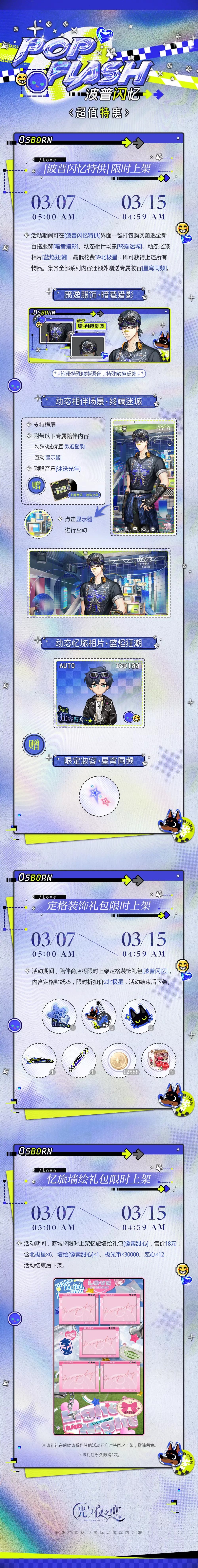 活动期间可在[波普闪忆特供]界面一键打包购买萧逸全新百搭服饰[暗巷猎影]、动态相伴场景[终端迷城]、动态忆旅相片[蓝焰狂潮],最低花费39北极星,即可获得上述所有物品。集齐全部系列内容还额外赠送限定妆容[星穹同频]。
