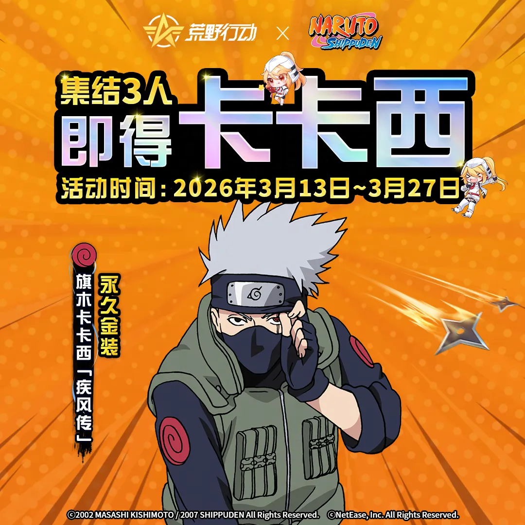 真的来了,国服火影忍者联动联动定档3月13日,来荒野集结送永久金装旗木卡卡西「疾风传」&联动10连抽!