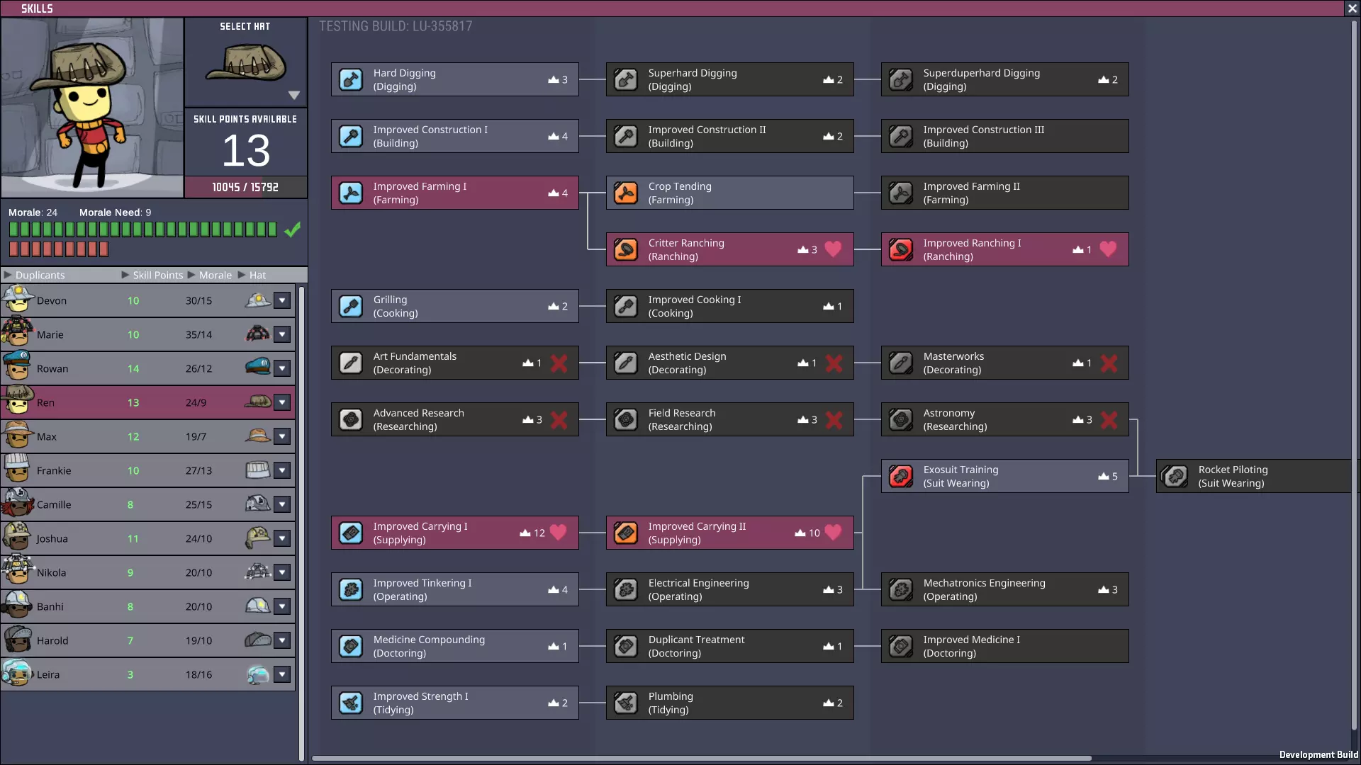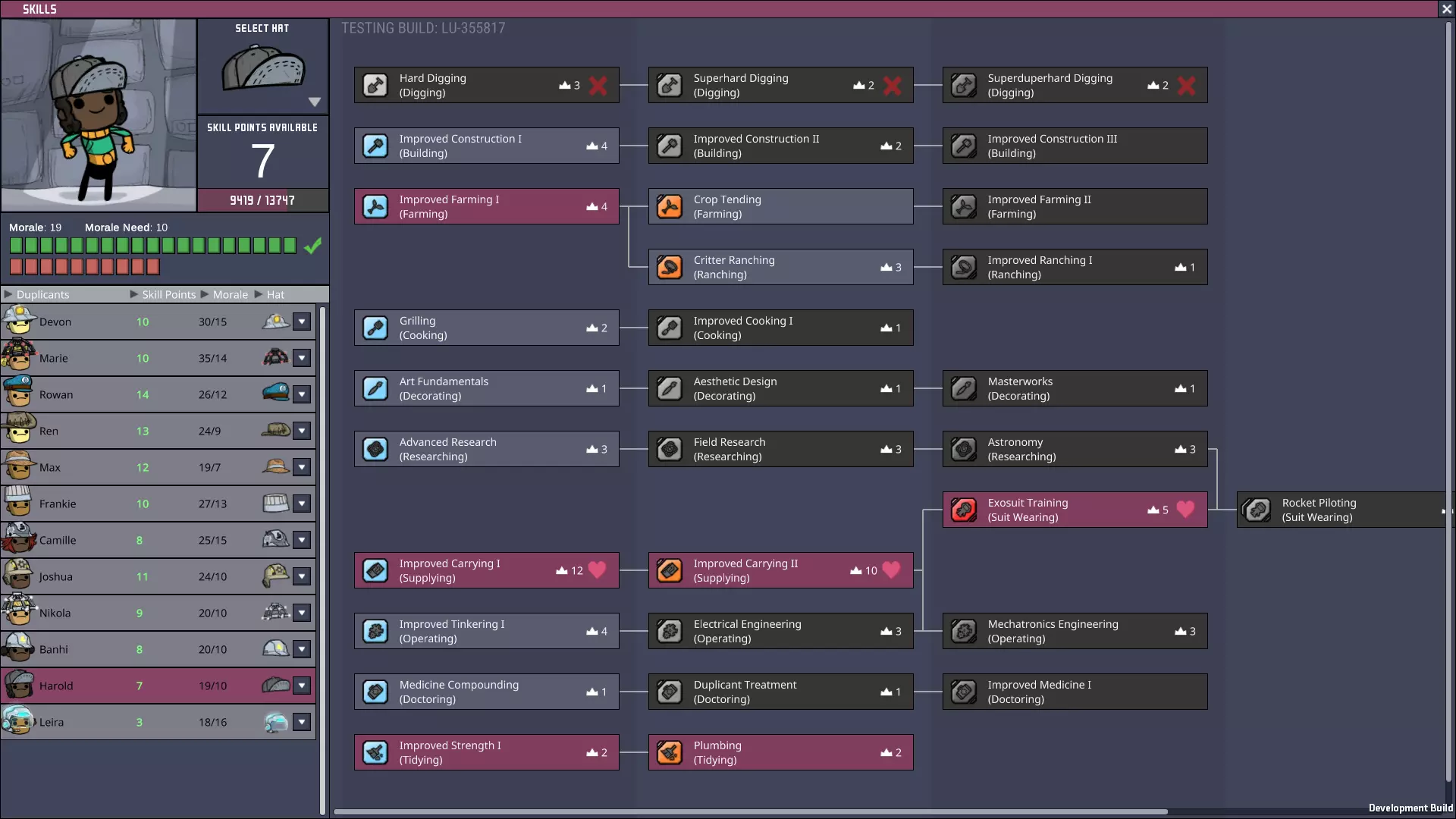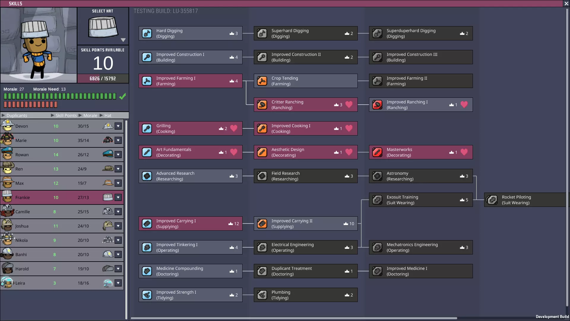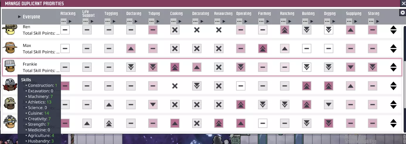 烹饪是一项非常耗时的任务,其中大部分工作需要通过【烧烤】技能解锁,因此明智的做法是选择一到两名复制人专门负责这些任务。当然,在游戏的大部分时间里,一名管理员会有空闲时间,所以给他们安排次要任务是明智的。农业直接为烹饪任务提供食材,而装饰则是一项相对不常进行的任务。由于烹饪和装饰都是影响士气的任务,因此在可能的情况下,将这两条技能线组合到同一个复制人身上是合理的——如果不能再增加一条技能线的话!我们可以选择最多三名复制人开始游戏,所以虽然这个模板无法和他们一起加入,但通常这是我寻找的第一个打印复制人。 实用技能 对于该模板的其中一个变体: