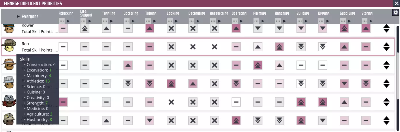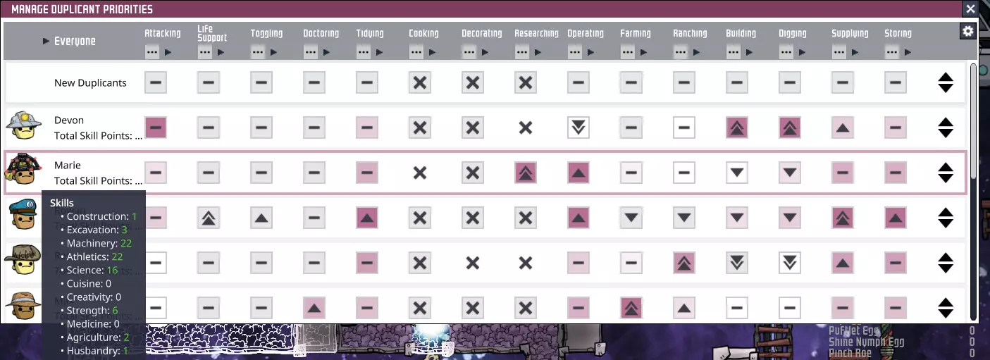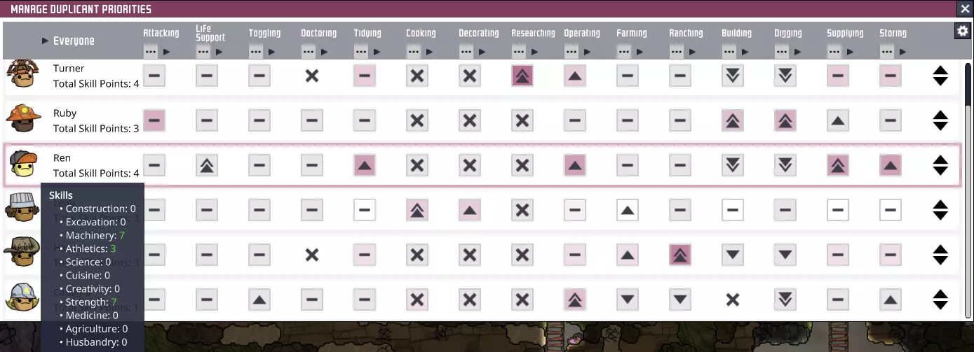 将鼠标悬停在任务列表中的某个项目上,会显示该任务优先级的完整计算方式。需要注意的是,游戏会为不同类型的任务分配一个默认的隐藏优先级。但根据我的经验,这并非同一类型所有任务的固定值。 为什么这很重要 《缺氧》中复制人分配任务的方式完全由每个复制人的任务列表管理。复制人不关心任务的位置,只会选择优先级最高的任务。即使启用了“启用 proximity”选项,它最多也只会在最高优先级的任务中选择最近的那个,可能还会有一个小的修正系数。因此,了解这些规则的运作方式并根据这些情况合理规划每个复制人的角色至关重要。本指南将介绍一些我认为非常实用的【复制人属性分配】方法,这些方法充分考虑了上述规则。虽然一开始可能有些难以理解,但它们能帮助你培养出专业化的复制人,让6名专业复制人完成8甚至10名普通复制人的工作。在选择复制人时考虑其专业化方向,将有助于你为基地维持一支平衡的劳动力队伍!需要注意的是,通常情况下,你应该避免让复制人立即在其技能树中消耗技能点——每当复制人学习新技能时,其士气期望值(红色条)也会随之上升。因此,你可以随时暂停技能学习进度,以防止基地内的压力值升高,直到你能够轻松应对这种情况为止。在游戏初期到中期,训练工人时必须考虑士气问题——确保复制人的士气值(绿色条)始终高于其实际需求值(红色条)!不用担心,在需要更高级别的工作之前,你会有足够的时间。 接下来,让我们了解一下具体的职责分配!三个初始小人 如果你是第一次接触《缺氧》,可能会纠结一开始该选哪些复制人——确实,这一点并不太明确。如果你现在正为此烦恼,以下是我的建议。