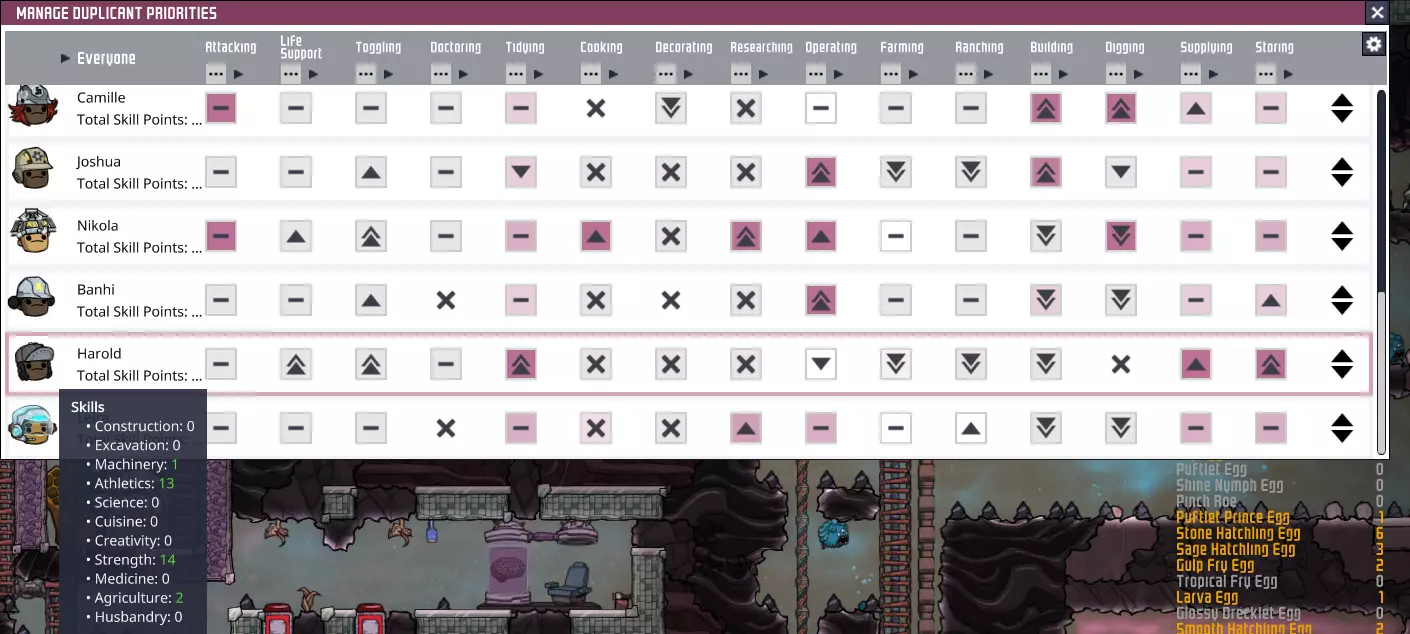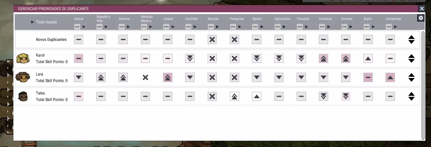 当你选择一个复制人时,游戏会显示一个窗口,其中包含关于他或她的各种信息。在这个窗口的左侧,有该复制人的【待办事项列表】视图。 这张图片是在游戏刚开始时截取的,当时还没有各种各样的任务类型,但它仍然很有参考价值。请将其与【 tales】的待办事项列表及其优先级设置进行比较。