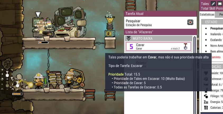 在《缺氧》中,优先级系统决定了复制人优先执行的任务类型。例如,在上图中,塔莱斯的“研究”优先级被设为“极高”,而其他大部分任务类型则处于默认或较低等级。因此,塔莱斯会优先执行所有可用的研究任务,然后才会考虑执行其他类型的任务。即使你将研究站的优先级设为1,其他所有任务设为9,只要研究站有可用任务且他正在寻找工作,他就会一直待在研究站。 如果你仔细研究,《缺氧》会揭示其在确定任务顺序时所采用的计算方式。复制人的某类任务个人优先级会乘以10,然后与任务优先级相加。 任务优先级