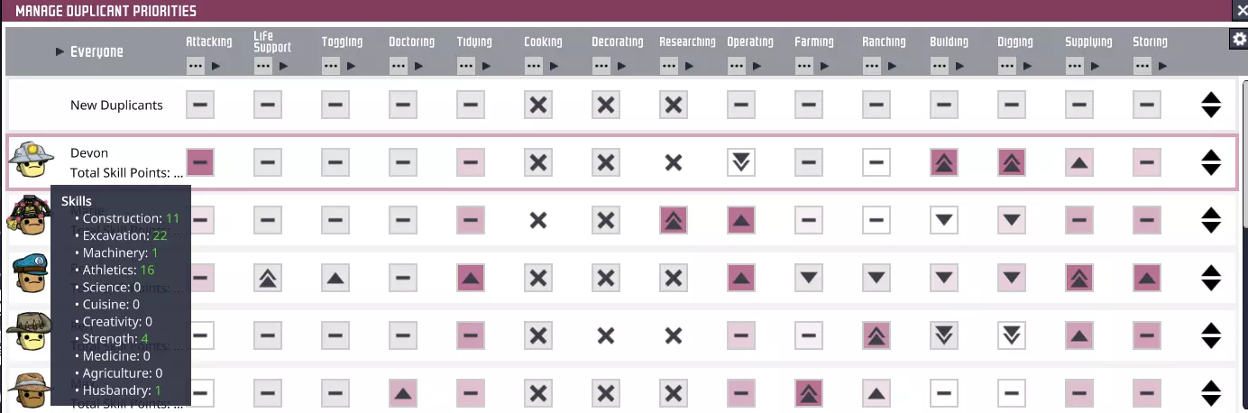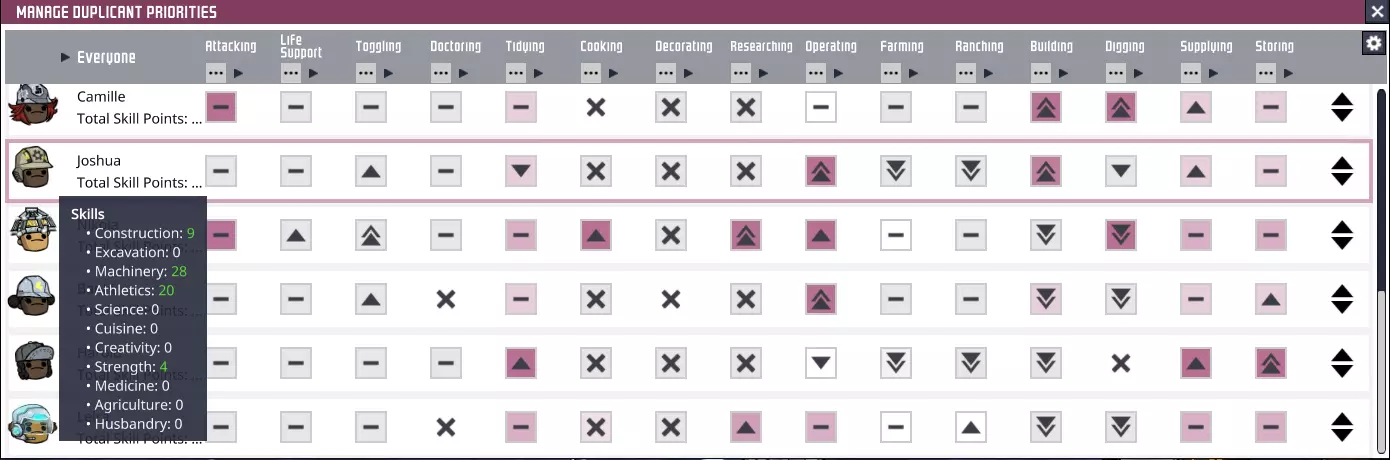 一份关于如何让复制人专精常见任务的指南,已更新至正式版。 作者 注意:本指南并非由我创作,而是由用户jahws创作。如果你喜欢这份指南,请前往他的指南页面。感谢jahws带来这份精彩的指南。关于任务优先级和结构优先级 《缺氧》的优先级系统旨在让基地的复制人能够进行更高程度的专业化分工。通过让他们专注于特定任务,你可以确保各种任务都能快速完成——每个复制人都会有自己偏好的任务列表,并且还能获得技能点,帮助他们提高在偏好任务中的效率。 如果你是来寻找快速参考的示例模式,可以查看右侧栏中“[b模式[/b]”之后的部分。不用客气。如果你想知道它们为什么以及如何运作,或者如果你想自己制作,那就继续读下去。我很乐意帮助你理解优先级系统。 现在,让我来揭开游戏管理优先级的神秘面纱。 个人优先级