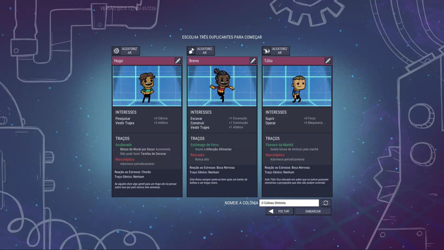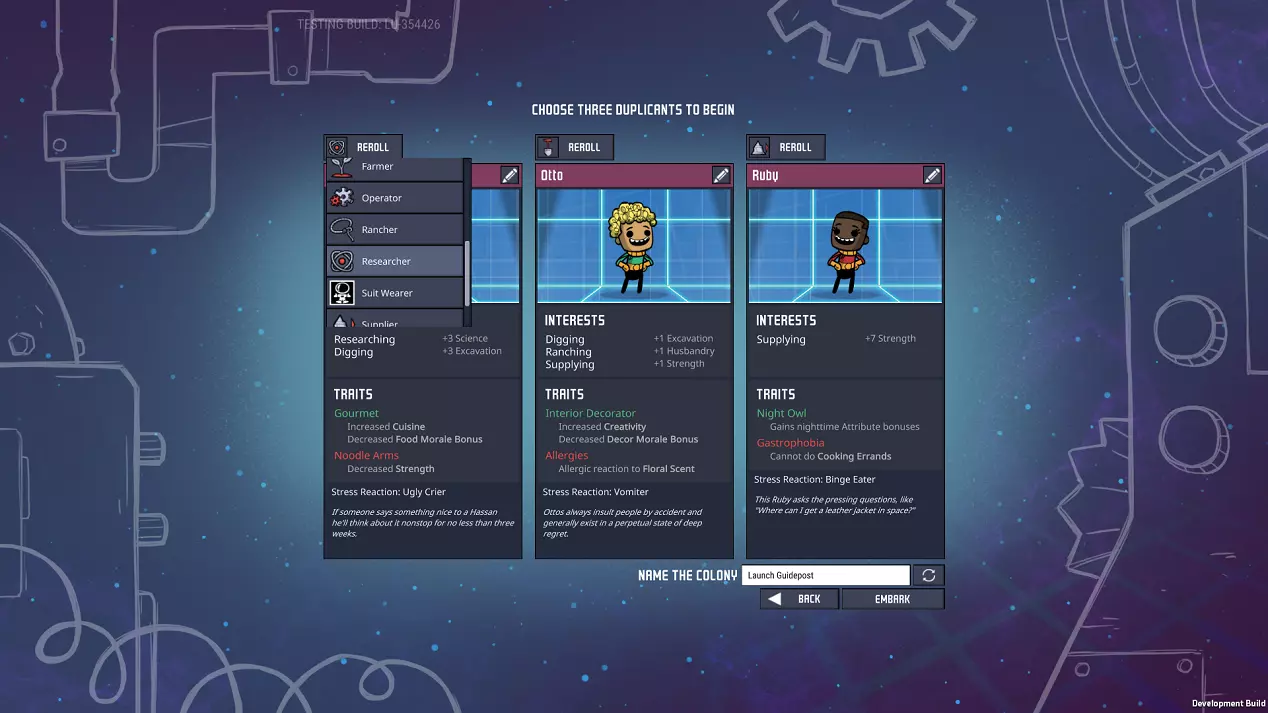 既然无法获得完美的复制人,你可以选择技能类型,确保在该位置生成的任何复制人都带有特定兴趣。使用此工具可针对以下模板: 研究型——适用于“研究员” 选择有1到2个兴趣的复制人。大量研究兴趣是理想的。 其他最佳兴趣是穿戴服装或补给。 挖掘型——适用于“开拓者” 选择有2到3个兴趣的复制人——确保复制人也有建造兴趣。 第三个理想兴趣是操作,但这在后期才更重要。 或者,补给或穿戴服装对危险区域的探索都很重要。Suprir - 适合“工头”或“收集者” 选择一个有两个兴趣的角色,不过兴趣数量可能影响不大。 由于我们刚开始,可以先把农业或烹饪兴趣当作临时选择,直到我们获得专门负责这些工作的复制人。 从长远来看,穿着服装会是个不错的兴趣。 或者,操作兴趣有助于后期建造某些高级建筑。 虽然有些特质是好的,有些则需要避免,但我会在我的游戏初期指南中详细说明这些细节: 建设中 ¯\_(ツ)_/¯ 例如,我为指南存档选择了以下三个: