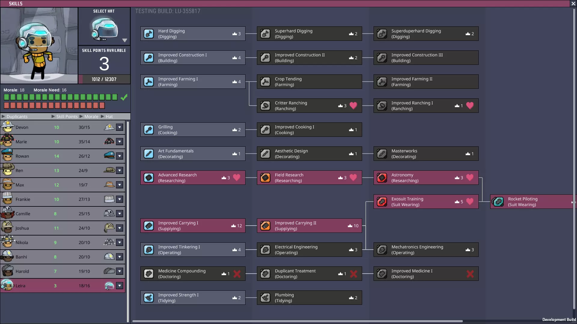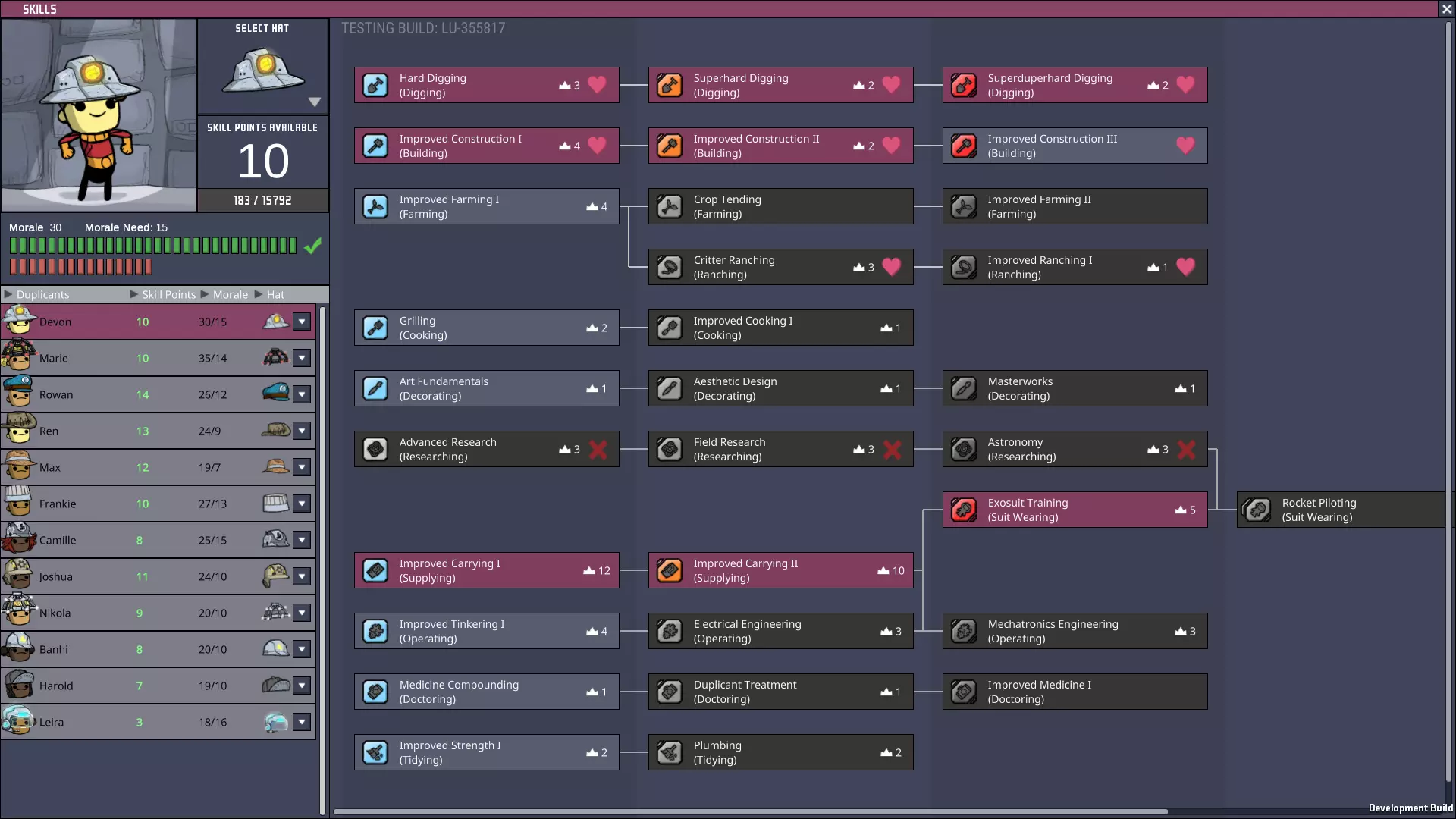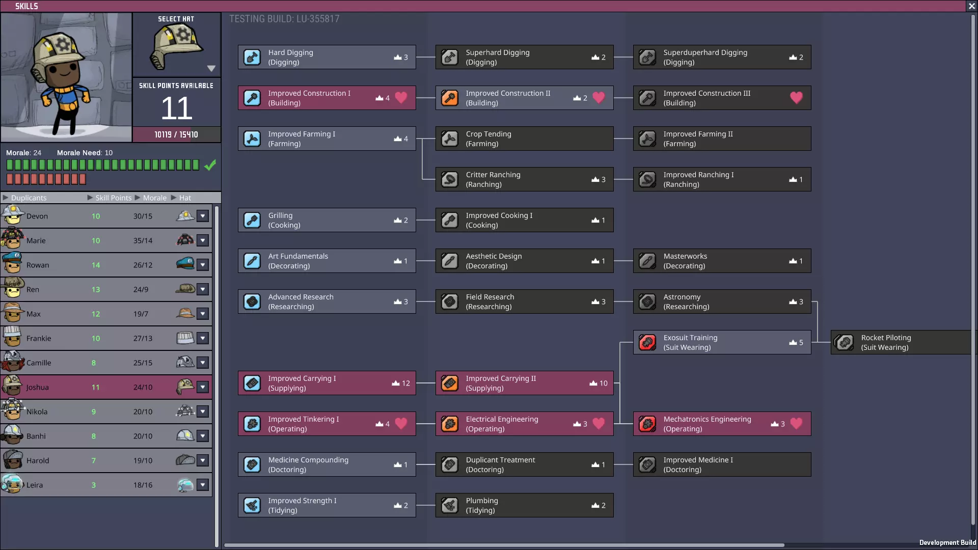 高优先级:研究 中优先级:操作 低/极低优先级:建造、挖掘——这些任务通常会让研究员远离基地中心和他们心爱的研究站。 其他提示:当游戏从初期进入中期后,你应该教这个复制人基本的供给技能。在分析间歇泉和喷气孔时,通常希望研究员穿着 atmosuit(气压服),这样他们的工作就不会中断——这也能为他们日后在士气允许时学习 exosuit(外殖装)训练技能做好准备。 当进入游戏后期并开始处理火箭时,这两个技能分支会合并,成为宇航员的前置要求。游戏会给你充分的理由用这种方式训练复制人,所以让我们好好利用吧! 还要注意,如果这个复制人没有他所拥有的兴趣爱好,他将更难维持士气需求!兴趣爱好对于让他们符合你的模式非常有用! “先锋”