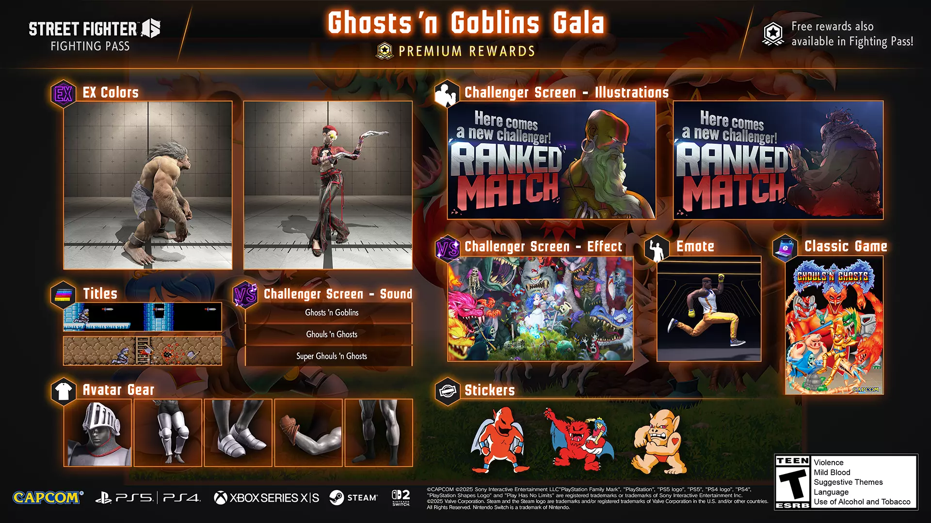 已为挑战者屏幕添加全新可自定义效果,包括【魔界村:复活】特效,以及达尔西姆和豪鬼发起对战时的视觉效果!获取所有效果,尽情享受格斗场吧! 同时推出以【魔界村】系列主角亚瑟为灵感的头像装备,包括骑士铠甲、骑士战靴,以及还原亚瑟跑步姿势的【亚瑟的奔跑】表情!你还能找到音乐曲目、贴纸,甚至经典街机游戏【魔鬼村】! 主题内容将限时轮换,不要错过获取机会!
