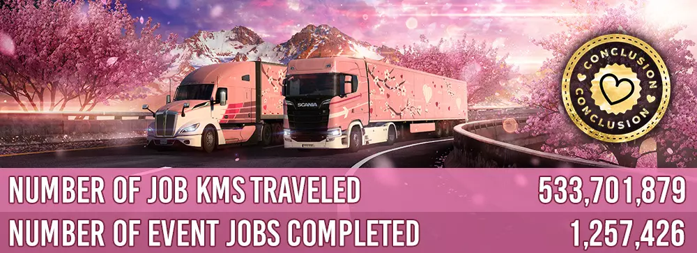 像往常一样,我们要感谢所有参与并助力此次活动的168,414名卡车司机,以及活动背后的敬业团队!社区的目标是在《欧洲卡车模拟2》和《美国卡车模拟》中完成600,000次情人节礼物运输任务,而令人激动的是,活动启动仅一周多,大家就达成了这个目标!最终,我们了不起的#BestCommunityEver共运输了1,257,426份情人节礼物货物,总行驶里程达533,701,879公里,在这两个里程碑上都超越了去年的情人节活动!