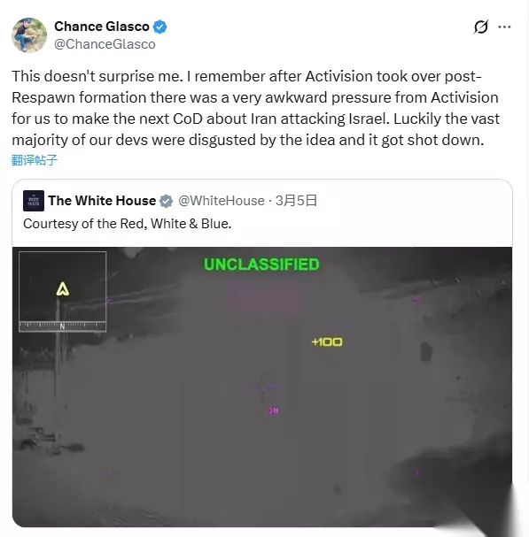 Chance Glasco 转发了白宫的推文并透露称,“这其实一点也不让我惊讶。我记得在 Respawn 成立之后、动视进一步接管系列的时候,他们曾经很尴尬地给我们施压,希望下一部《使命召唤》讲的是伊朗攻击以色列的故事。好在我们大多数开发者都觉得这个想法很恶心,最后这个主意被否掉了。”