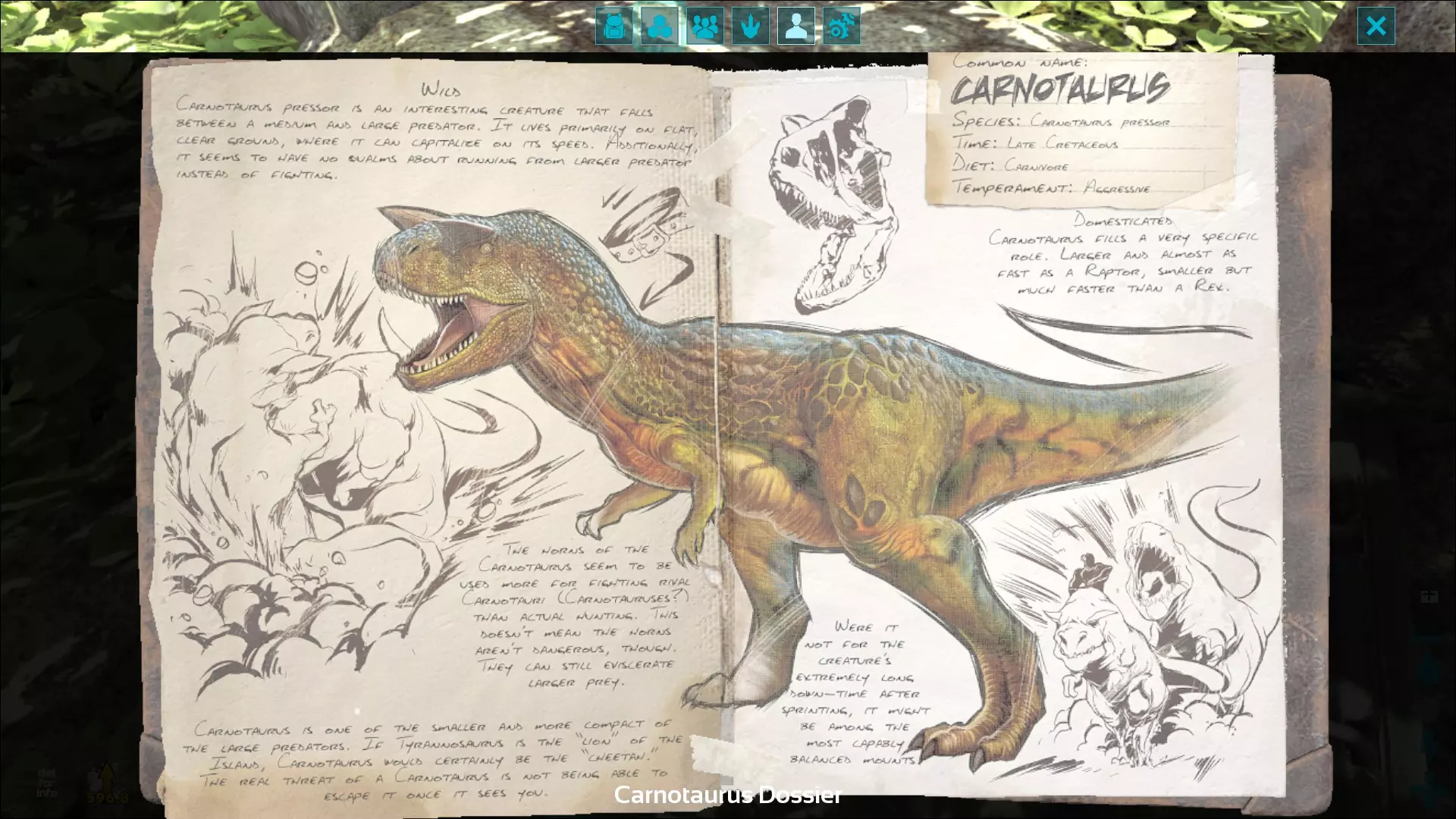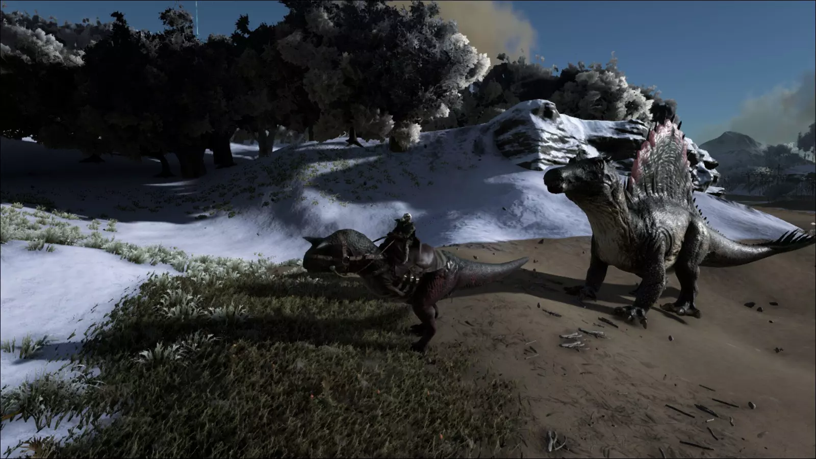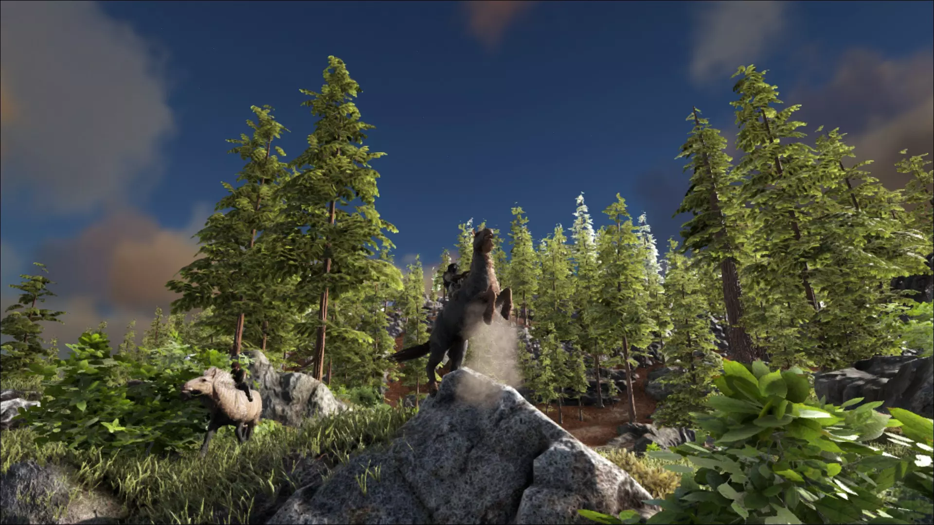 对于那些喜欢更刺激玩法的玩家来说,食肉恐龙或许能带来乐趣。它们同样种类繁多,除了陆地上的种类,还有空中和水中的代表。这一类恐龙数量众多,既有速度快的奔跑者、擅长游泳的(或者两者兼备的:重爪龙),也有攀爬能手和跳跃能力强的恐龙。当然,还有会飞的恐龙,不过这点我已经提到过了。和食草恐龙一样,食肉恐龙也有各种大小和形态。除了其中最著名的两种——霸王龙和迅猛龙,像美颌龙、伤齿龙这类体型较小的恐龙,还有小盗龙(看起来像始祖鸟,但其实并不是),都是非常凶猛的生物。它们体型太小,让人难以及时发现,速度又太快,让人几乎没有机会应对。你可不能忽视(也不能听漏)霸王龙的“大哥”——南方巨兽龙。南方巨兽龙就像是三只小猪故事里的狼,只不过体型更大、声音更响、速度更快……总之就是更厉害,连石头房子也根本挡不住它。水里还有更大的生物等着把你当美餐,比如铅笔大小的巨型乌贼,或者巨齿鲨(相比之下,大白鲨简直就像鱼缸里的金鱼)。而且,既然这一切还不够危险、不够令人恐惧、不够具有挑战性,游戏中还额外加入了拥有更强力量的阿尔法生物,以及狼群、异特龙群等群体生物,还有羽暴龙。羽暴龙虽然看起来像是小型霸王龙和名贵公鸡杂交的产物,但它却能领导一群食肉牛龙,并且能咆哮着吓跑大多数生物(包括已被驯服的生物)。如果现在还有人想念僵尸的话,那真的是没救了……