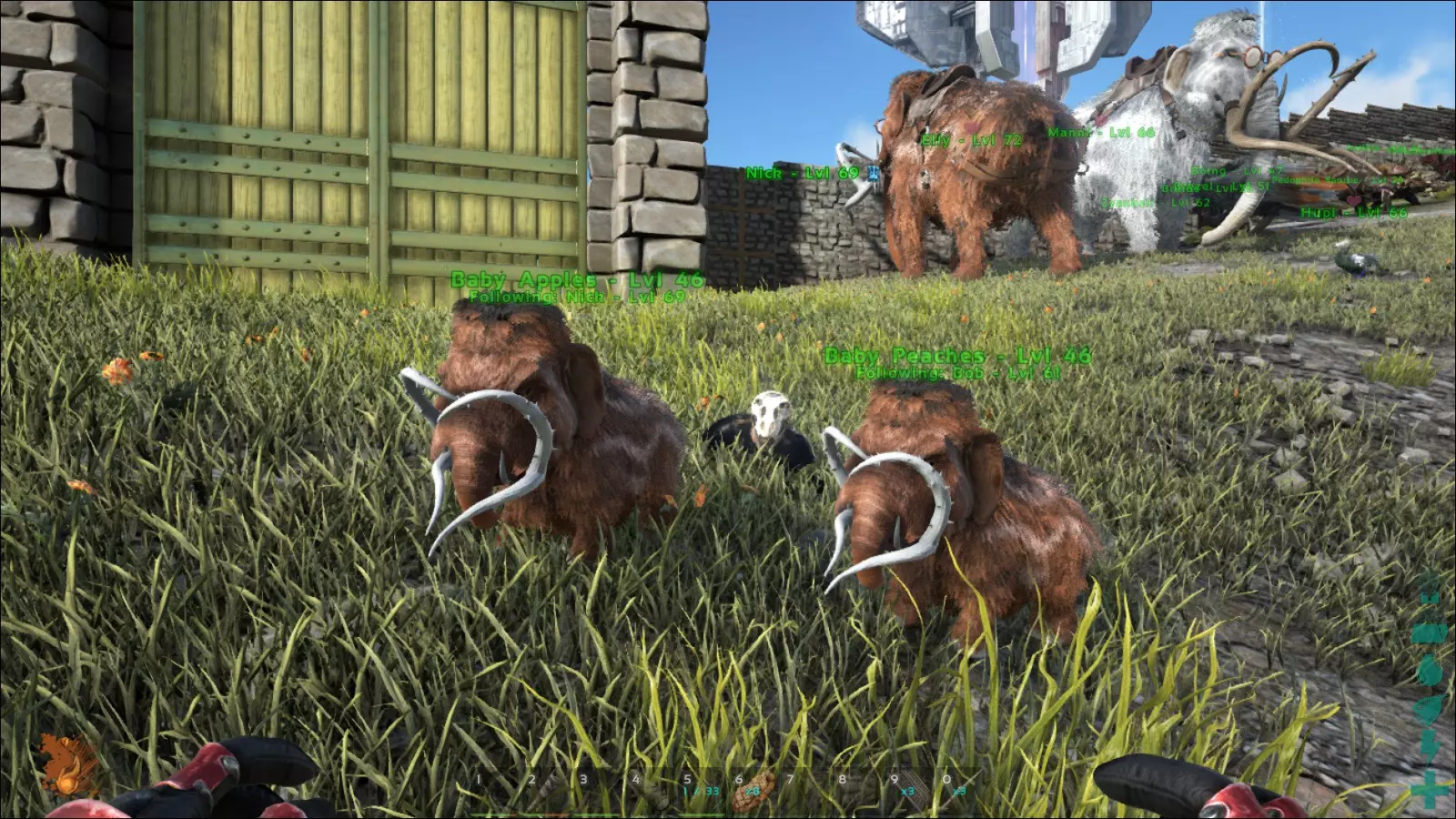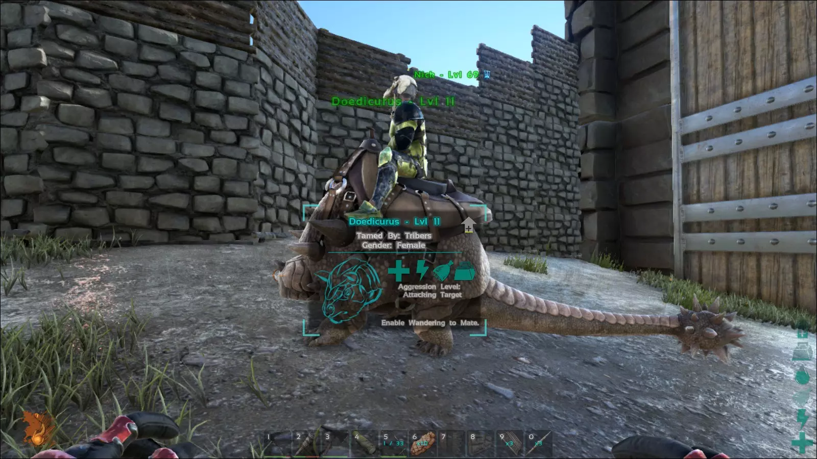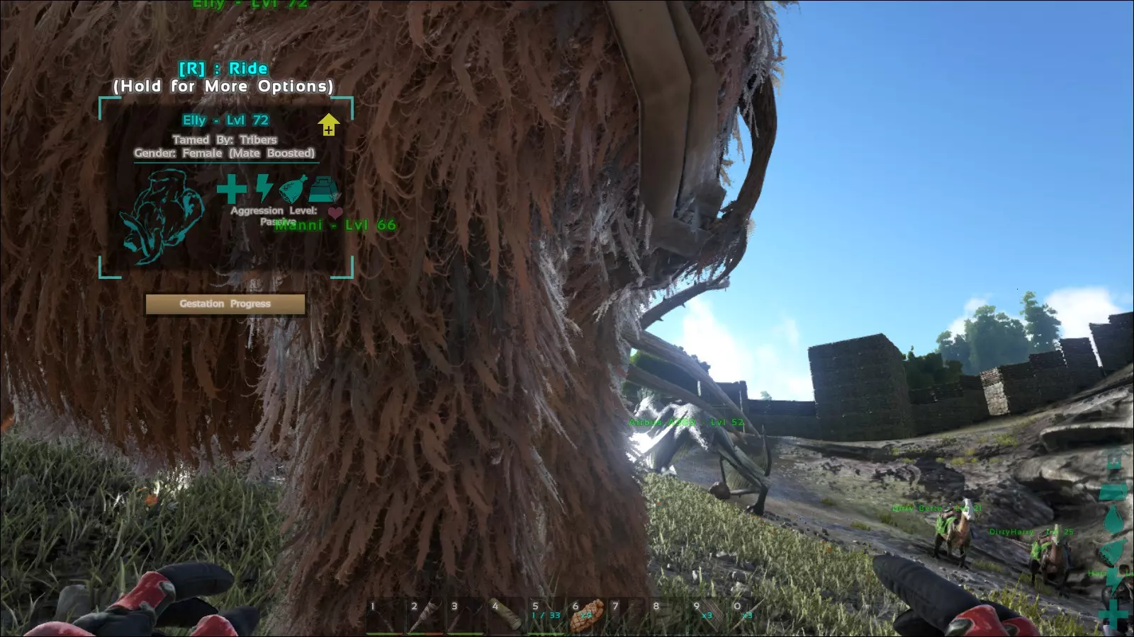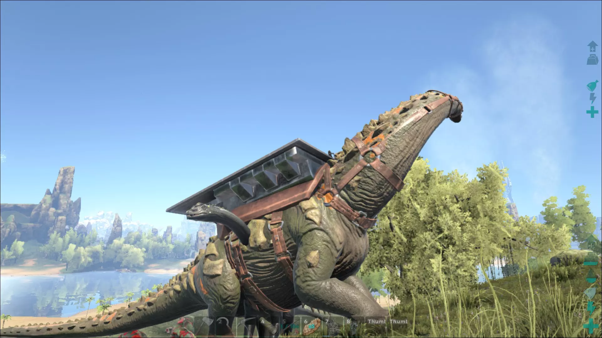 资源获取 有些可骑乘的生物移动速度非常慢,即便它们的负重能力很强,也难以让人产生使用它们的欲望。大地懒和甲龙就是很好的例子。这两种生物移动起来确实慢条斯理,但它们往往具有很高的实用价值。如果想要大量获取燧石、石头或金属,仅靠(尖)镐是远远不够的。这时,就需要借助这些出色的生物了。在采集浆果或砍伐木材时,人们通常也会依靠各自专门的生物伙伴。